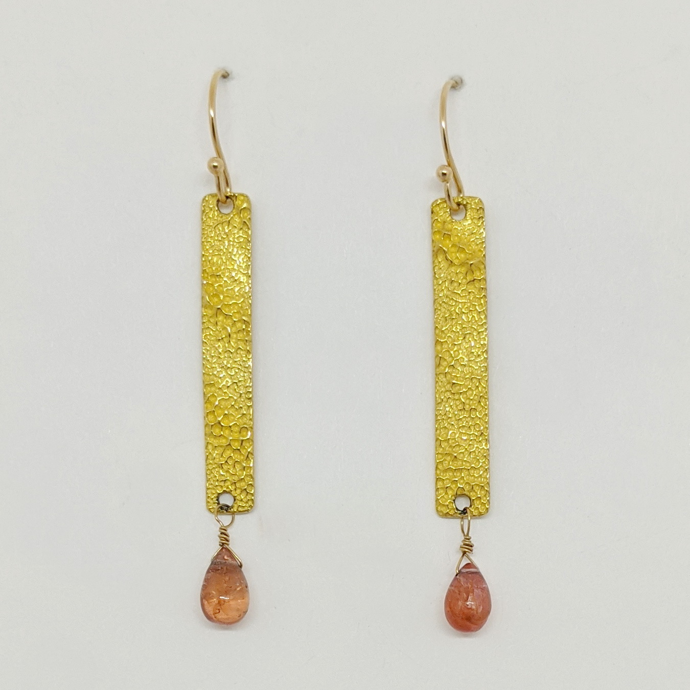 22kt. Gold Long Textured Earrings with Peach Tourmaline Drops by Veronica Stewart