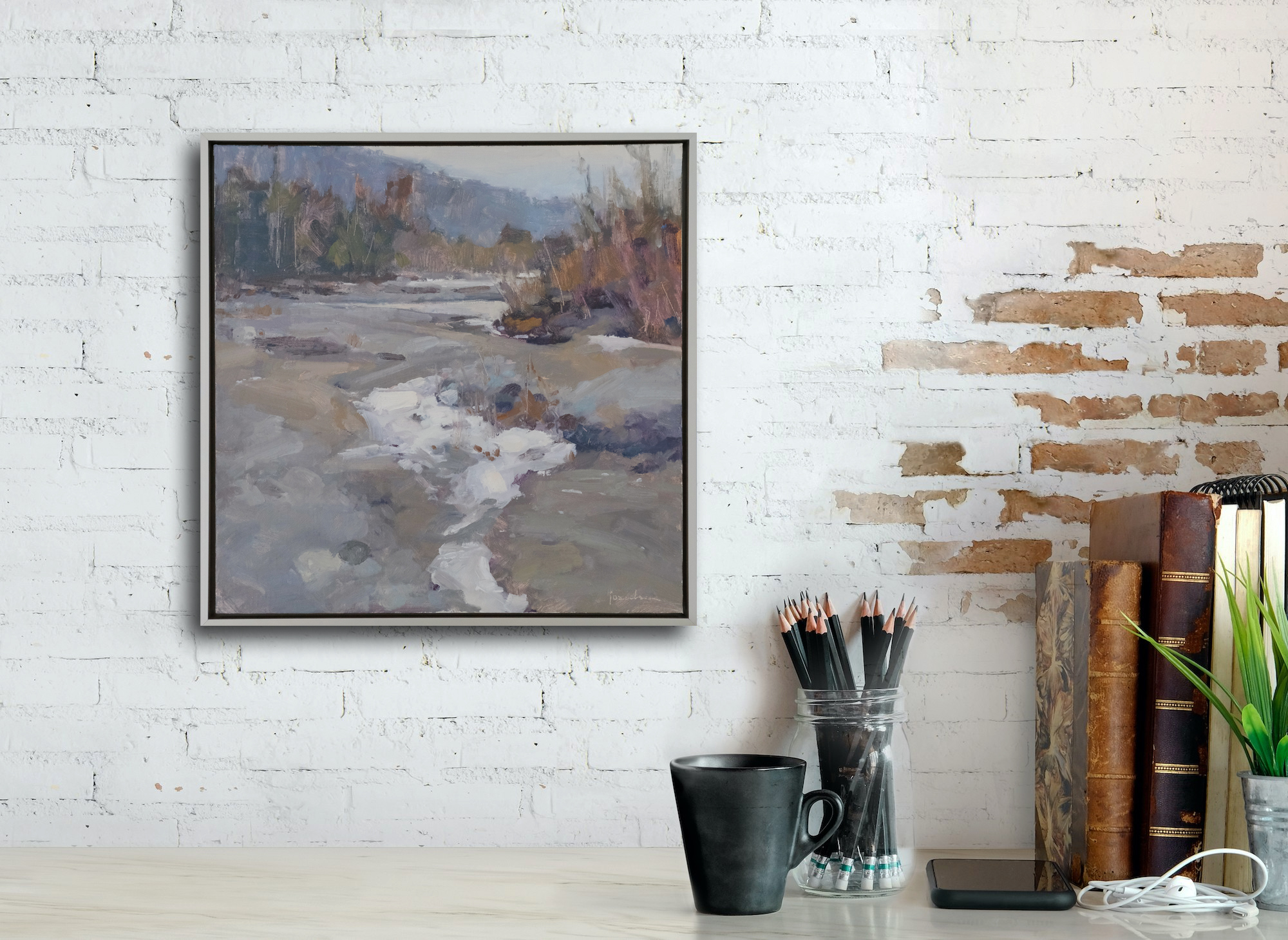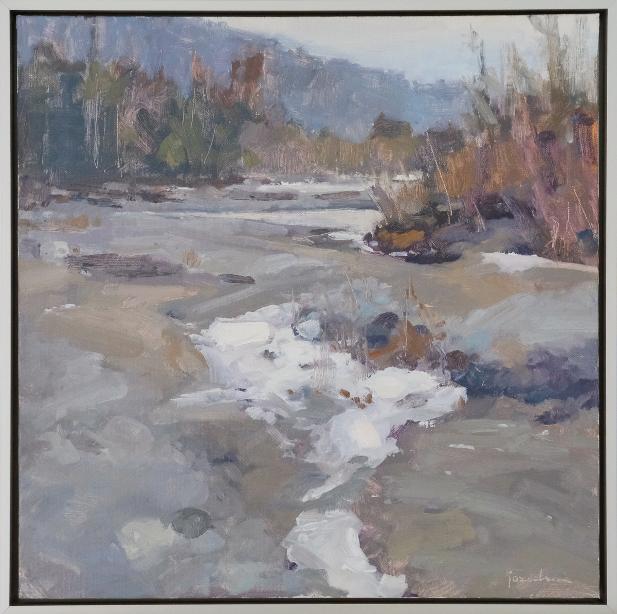 “As I painted the dry riverbed in winter, the simple beauty of the scene unfolded before me… the gentle greys of the landscape, with frozen patches adding a subtle sparkle. Working en plein air, I felt a quiet connection to the calm and stillness around me. For me there is a kind of peaceful elegance in these understated moments. This painting is a quiet tribute to the beauty found in nature’s subtle details and the calm of the winter season.” – Maria Josenhans