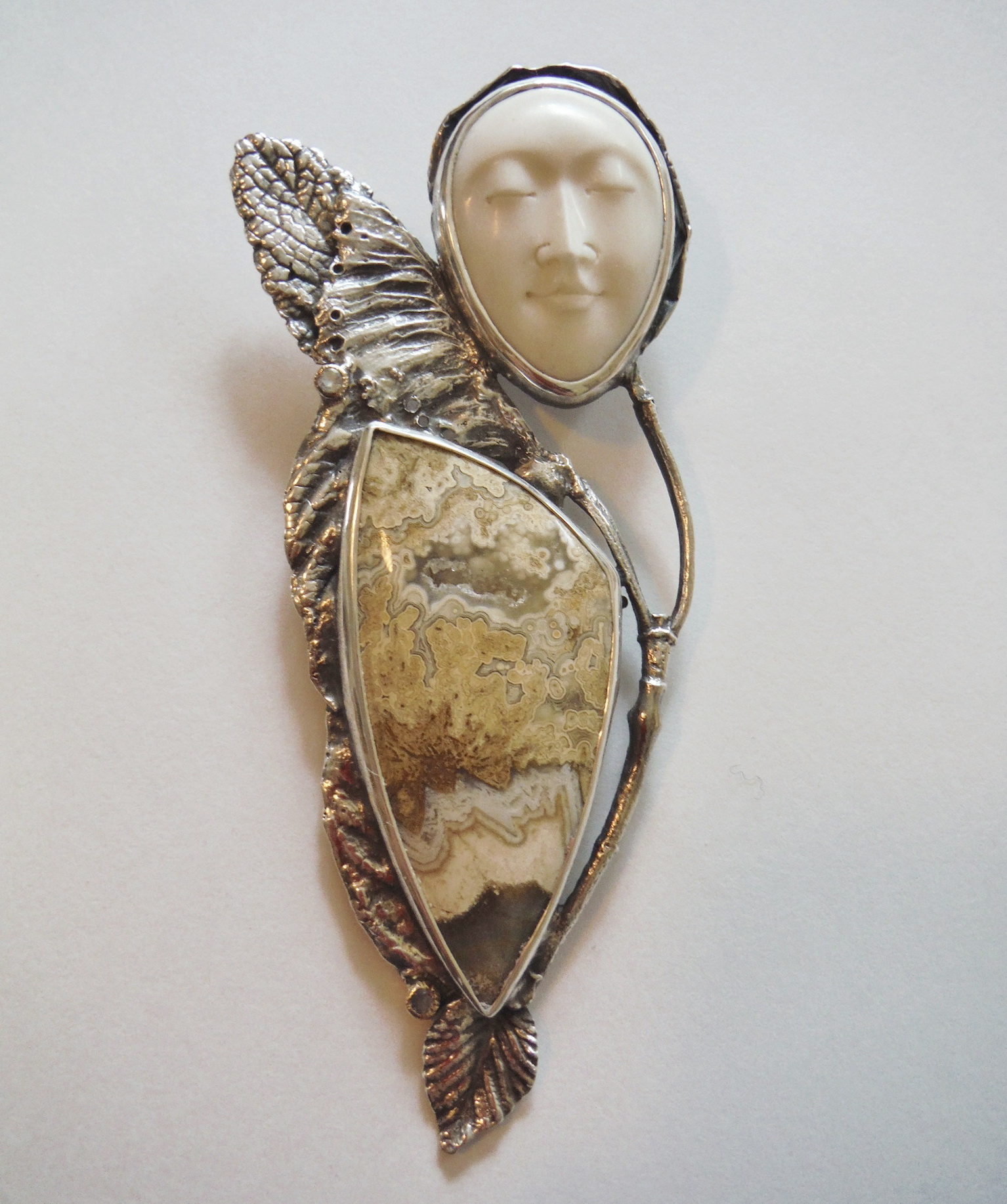 Ocean Jasper, Natural Druzy, Moonstone, Carved Bone, Sterling Silver, 14kt Gold