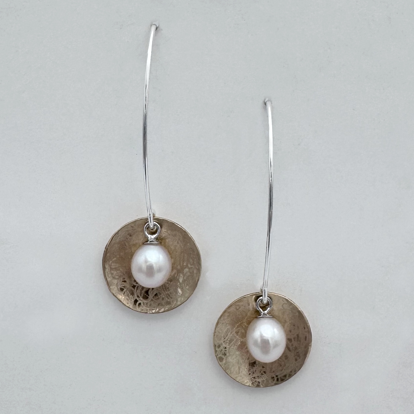 Balanced Scribbled Concaved Gold-Filled Disc Earrings with White Pearls by Chi’s Creations