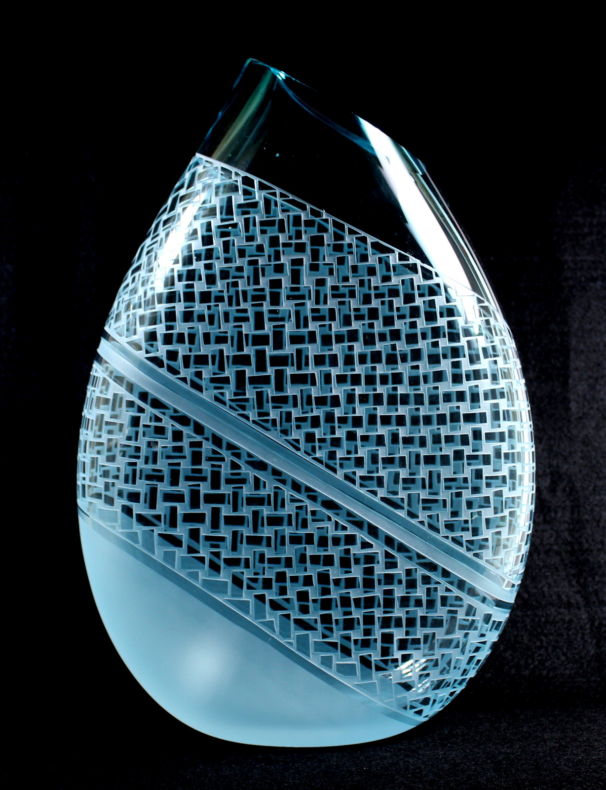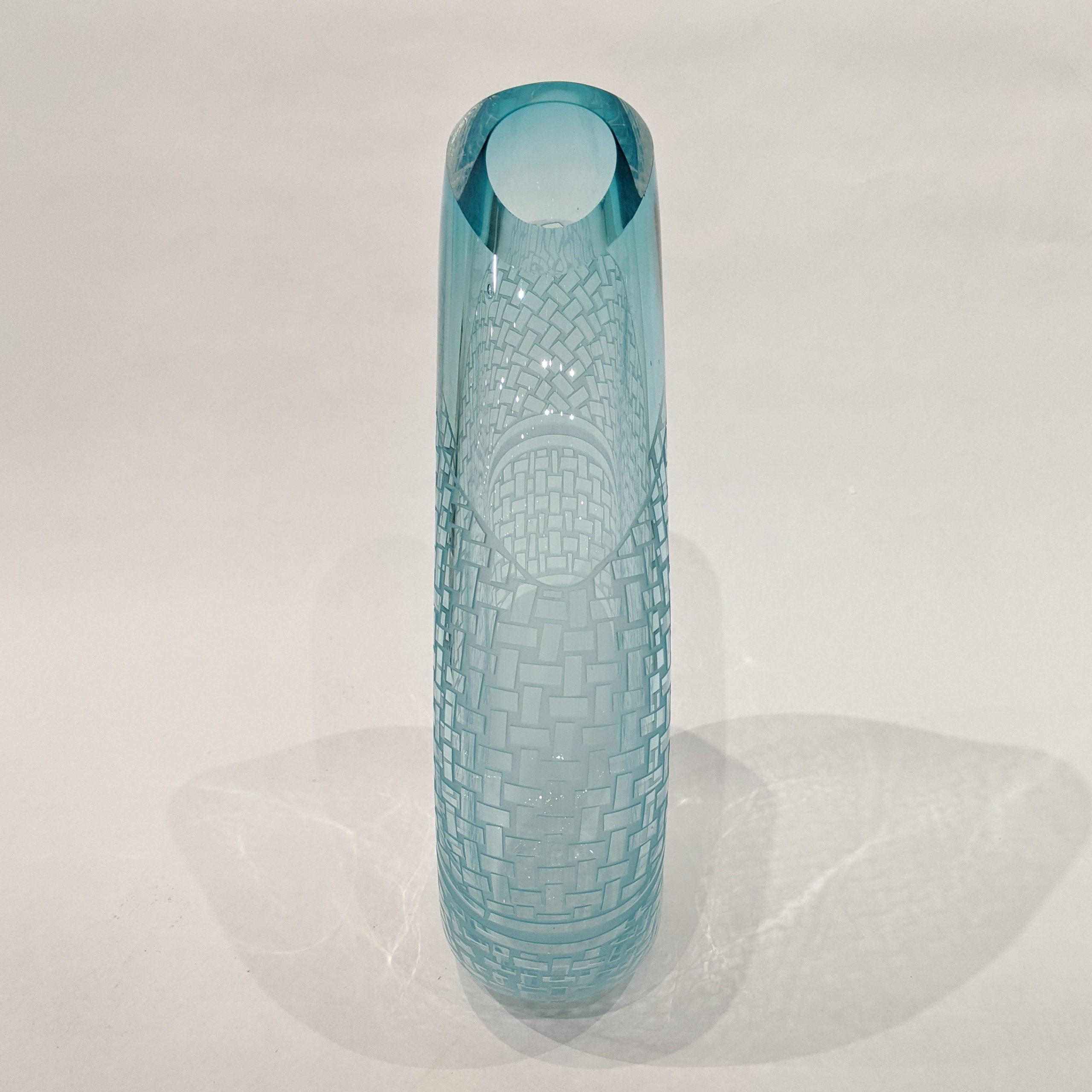 “This piece plays on the simplicity of a simple rectangle to create a complex pattern that evokes the pattern of a woven basket.  Patterning in three dimensions requires that the image works through all the curves of the piece.  Placing this piece in strong horizontal light will create interesting refractions on the surface behind the piece.” – Guy Hollington