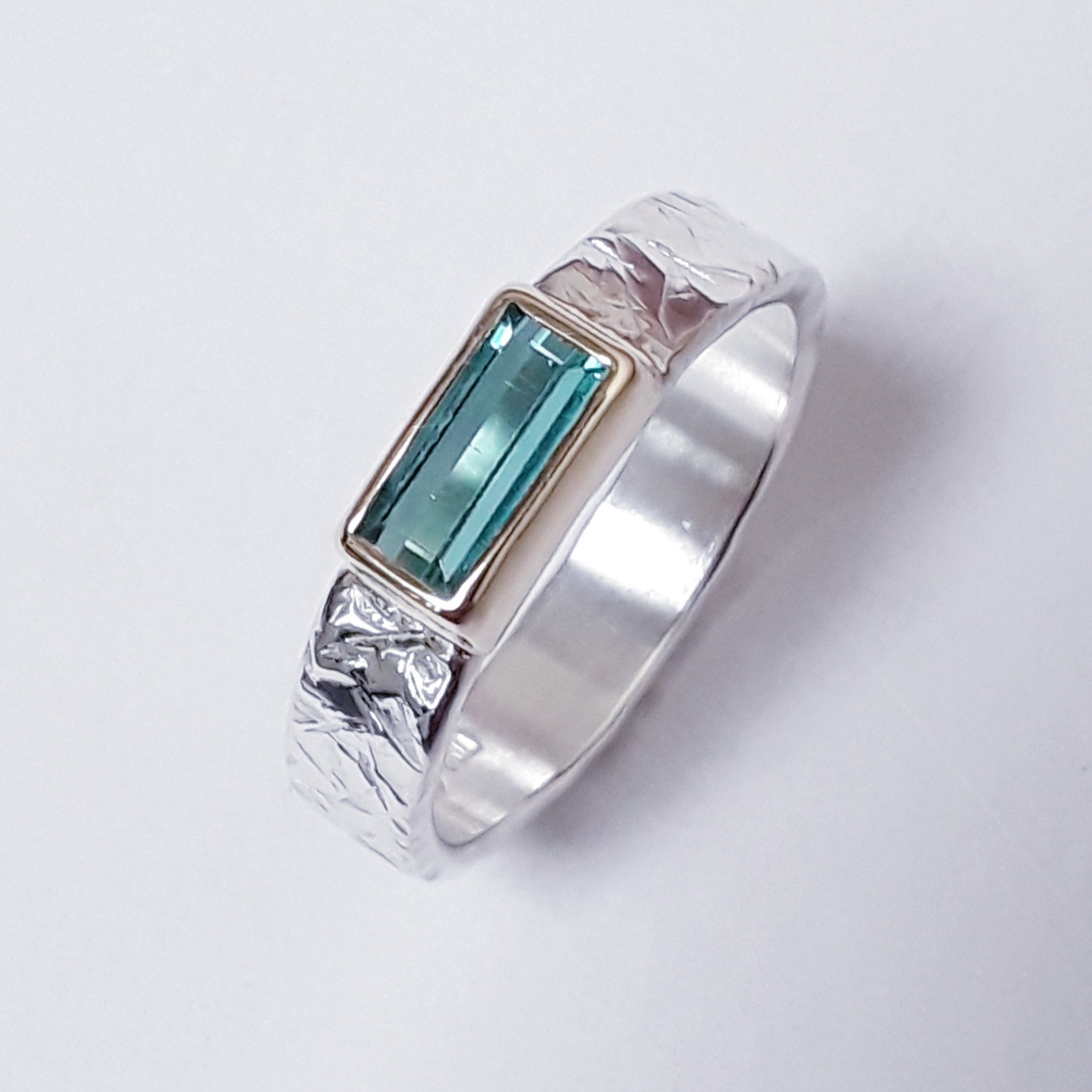 Sterling Silver, rectangular cut Brazilian blue green Tourmaline, 18kt. Yellow Gold