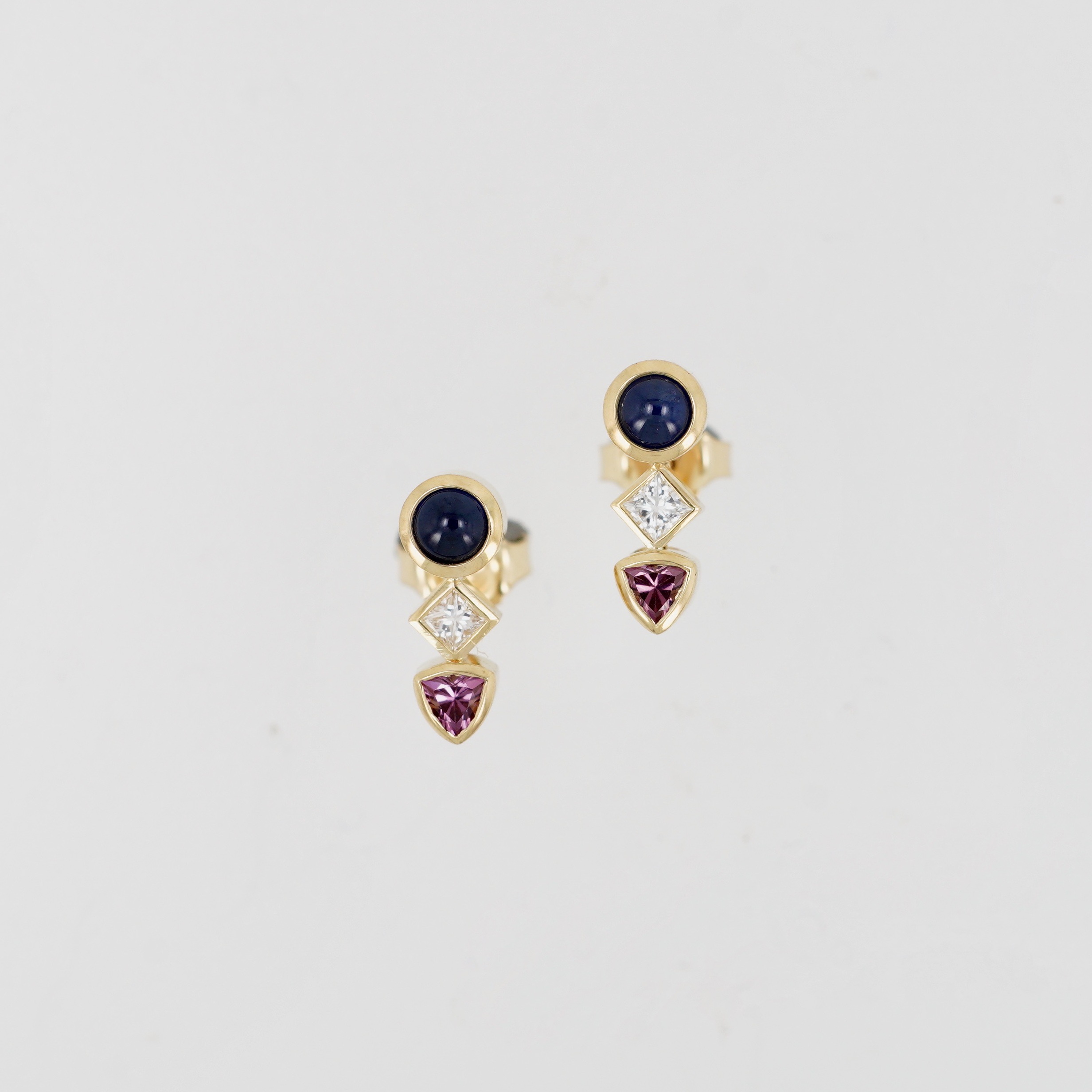 18kt. Yellow Gold, 0.82ctw cabochon Blue Sapphires, 0.14ctw Princess Cut Diamond G/H SI, 0.29ctw Malaya Garnet, 14kt. Yellow Gold Ear Backs