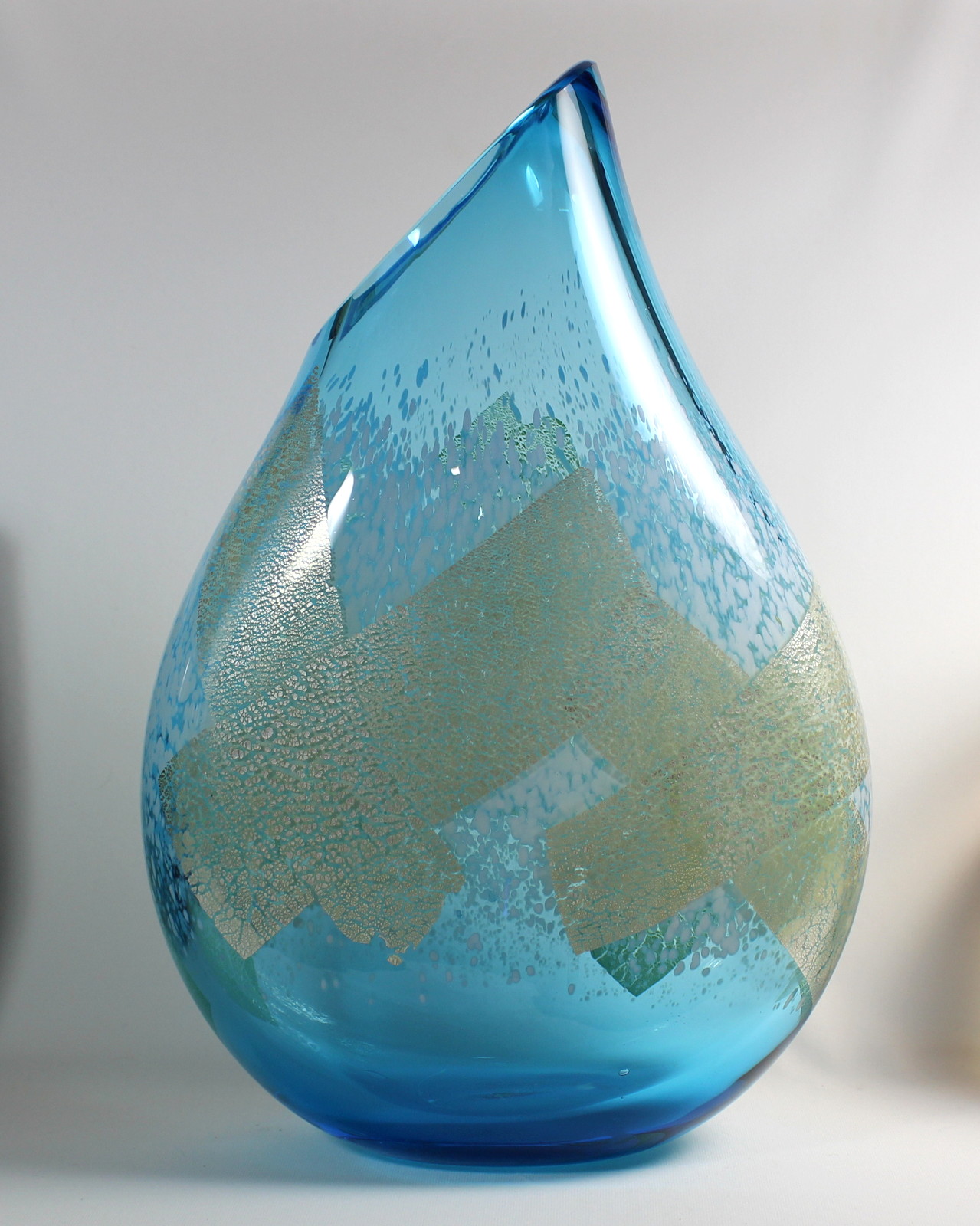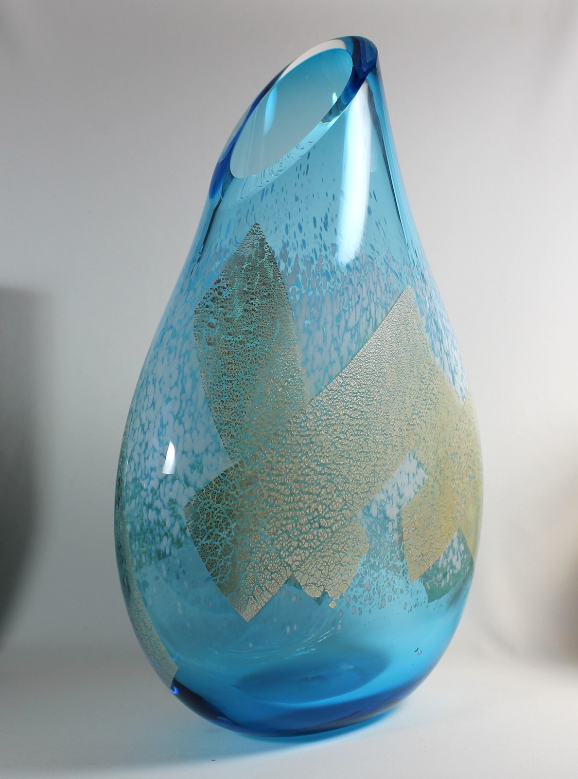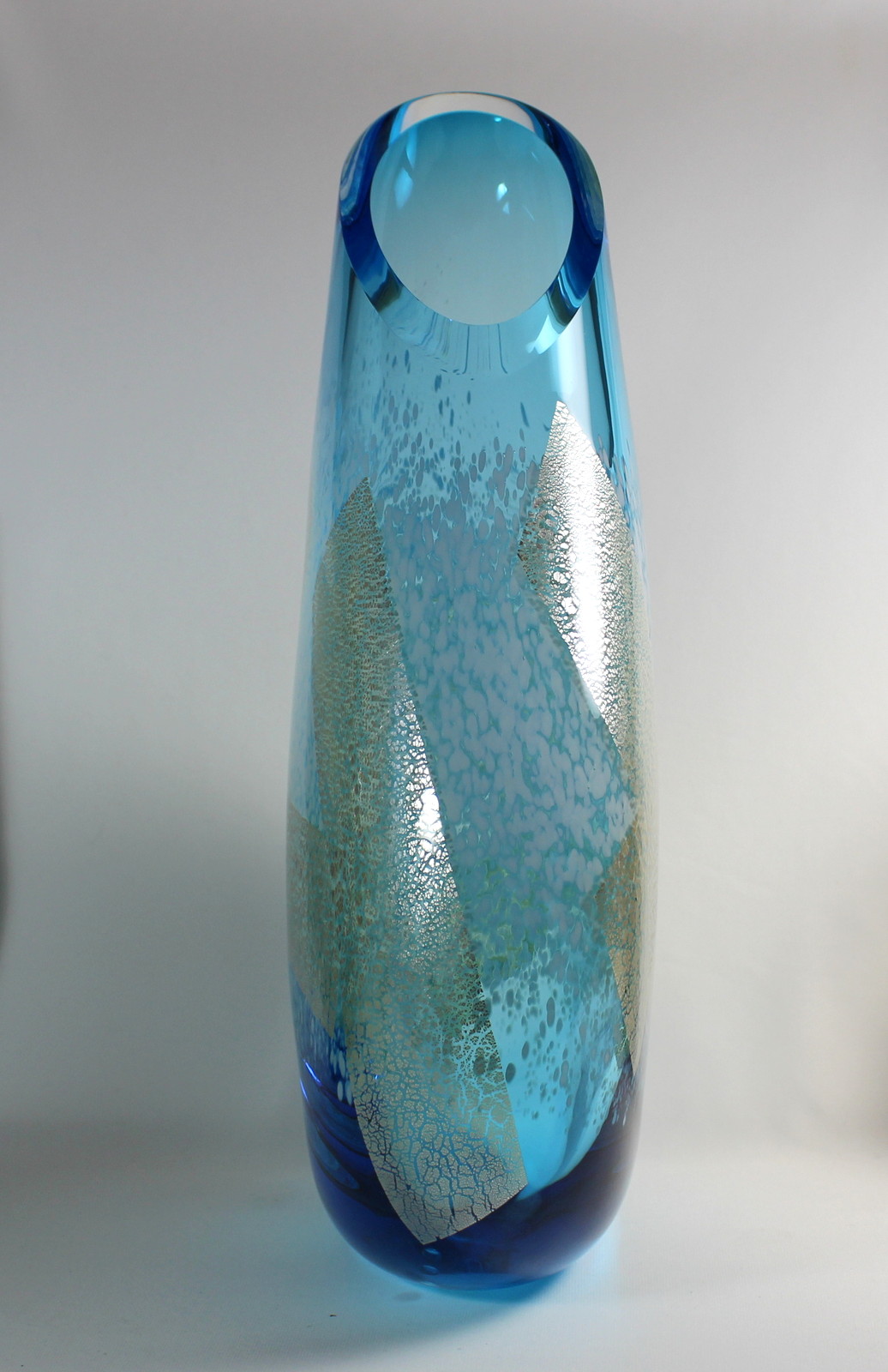 Thin silver leaf is added to this piece towards the end of the blowing process. As the piece is blown out further, the silver stretches and tears into an interesting mottled pattern. The silver has oxidized slightly turning almost gold in colour. – Guy Hollington