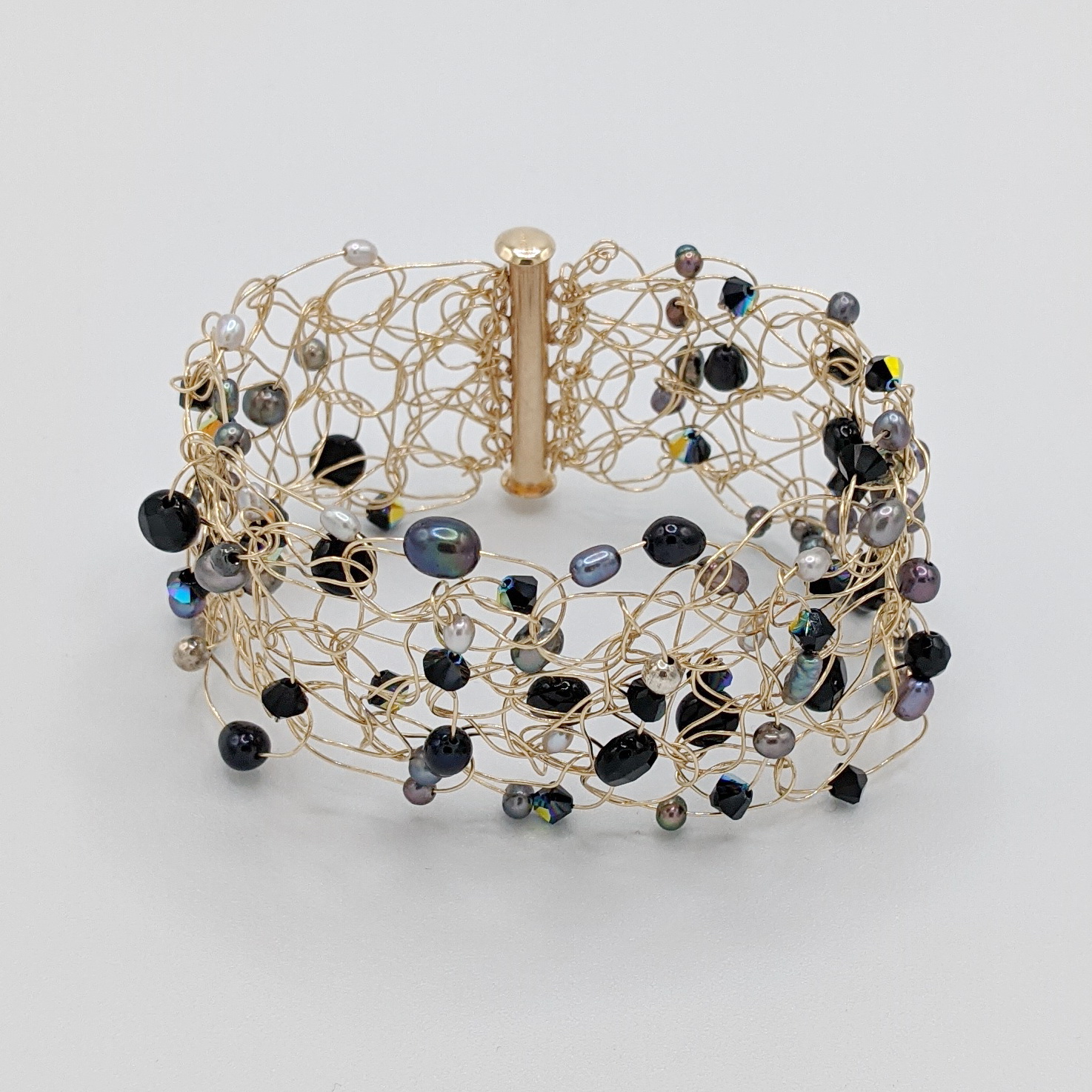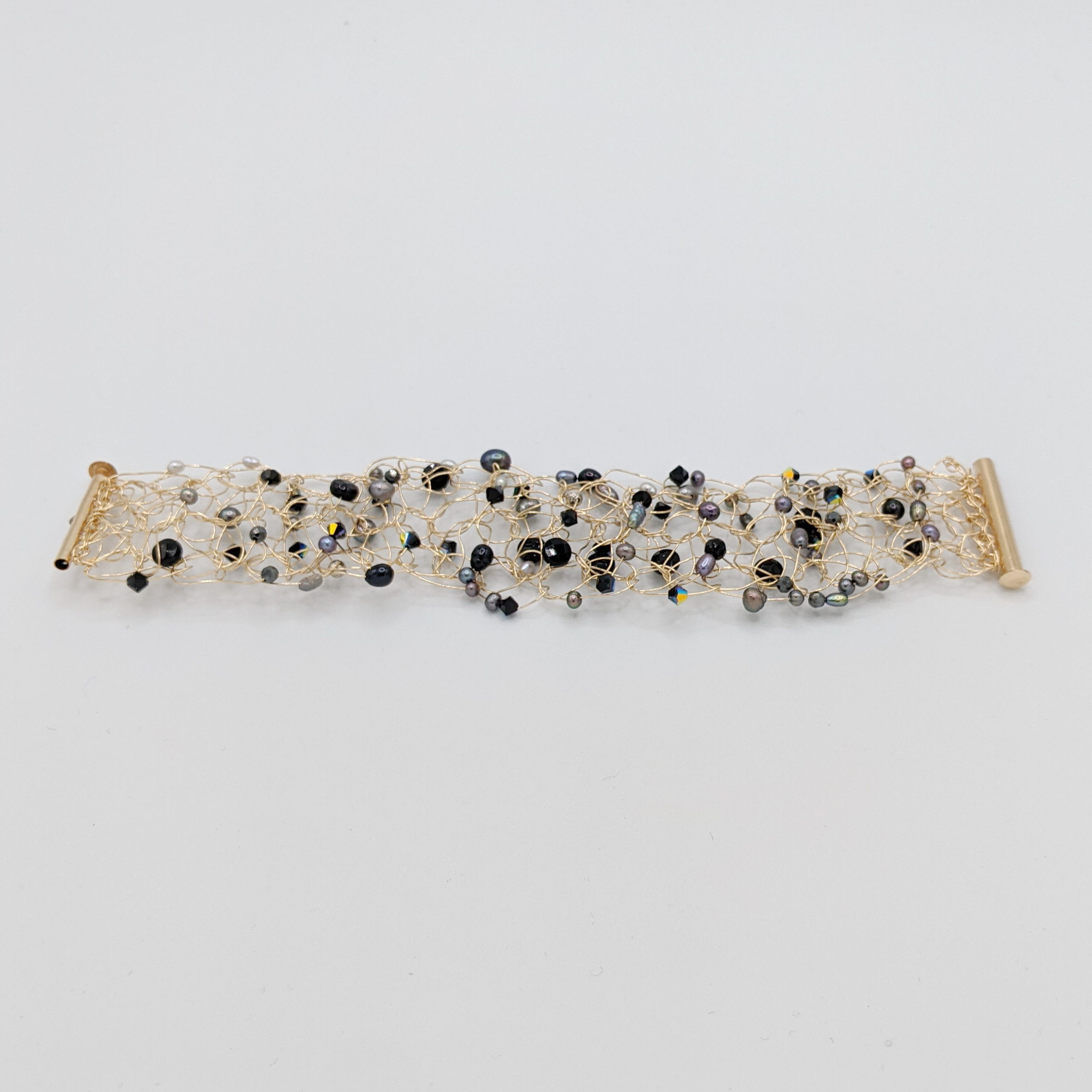 Crocheted Gold-Fill Cuff with Pearls & Black Swarovski Crystals by Veronica Stewart