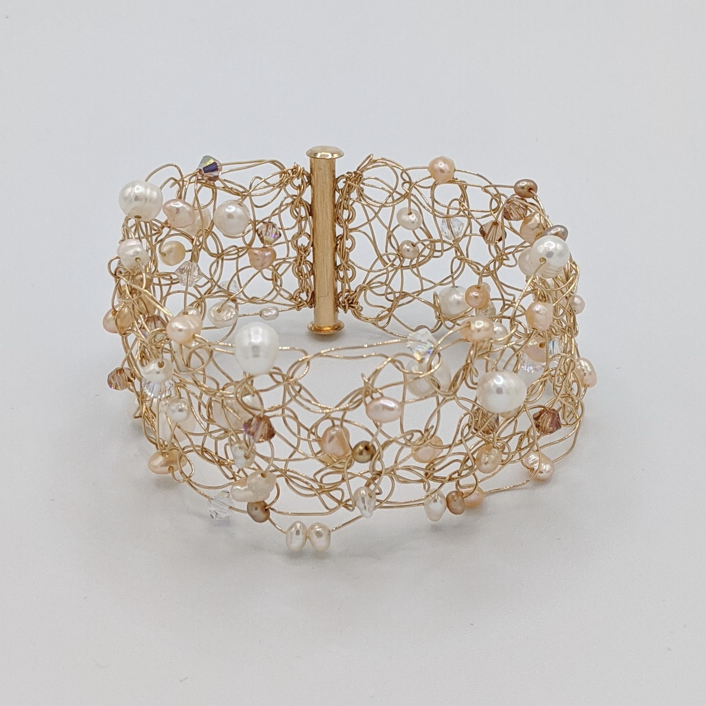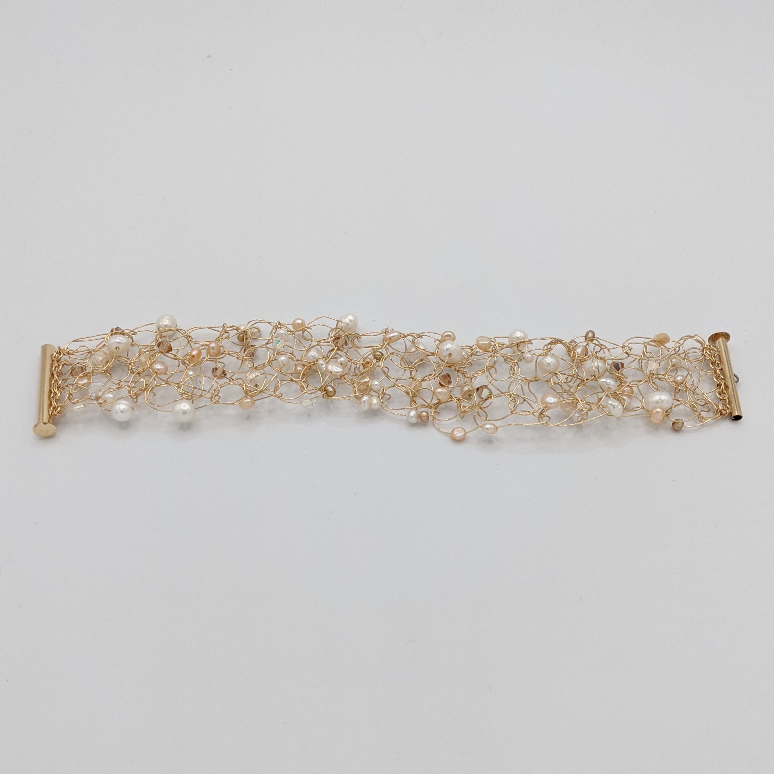 Crocheted Gold-Fill Cuff with Pearls & Clear Swarovski Crystals by Veronica Stewart