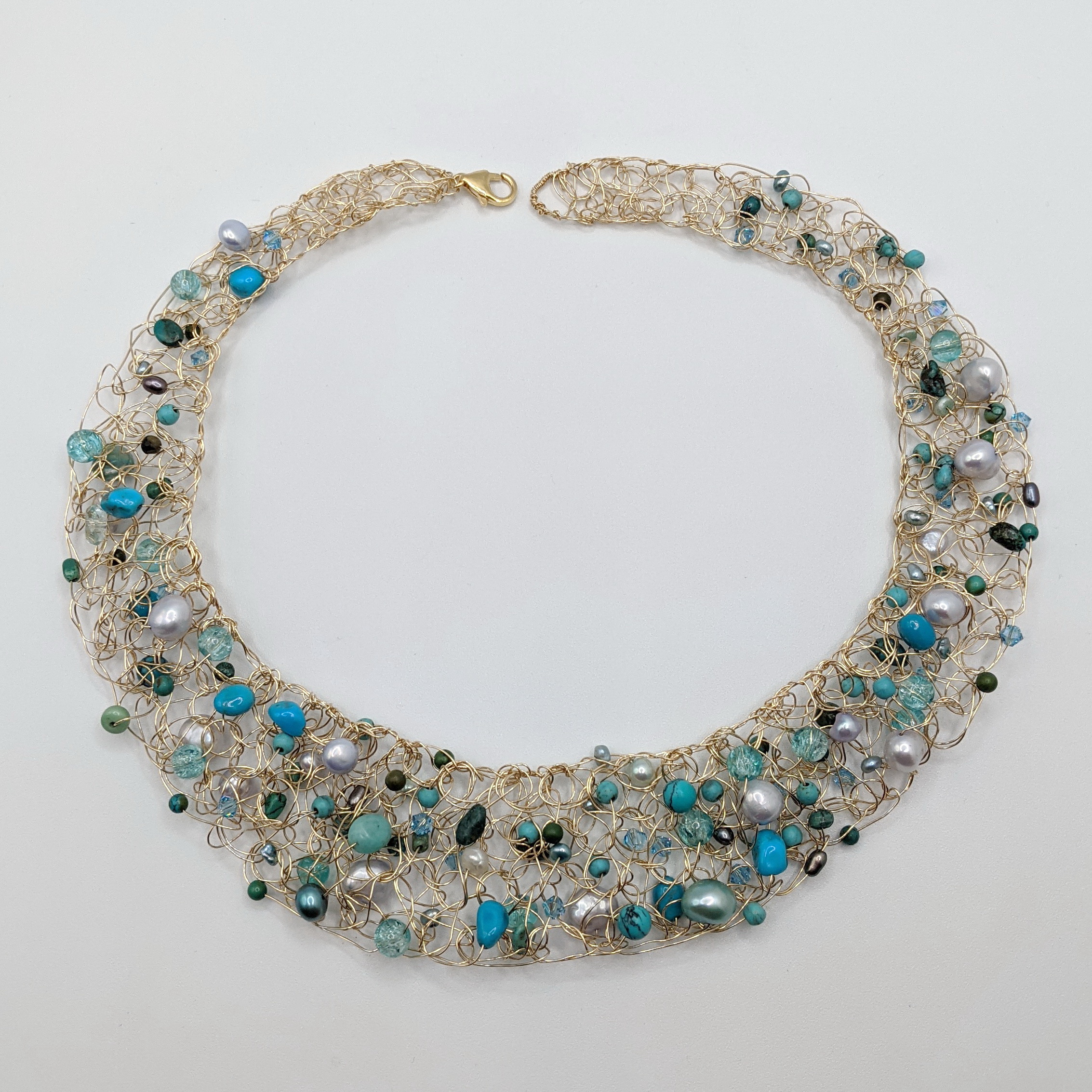 Crocheted Gold-Fill Wire Collar with Turquoise, Blue Pearls & Blue Swarovski Crystals by Veronica Stewart