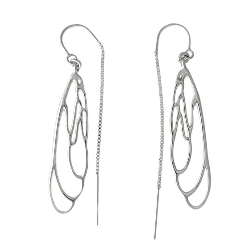 I finally created smaller version of my popular Dragonfly earrings! In Japan, Dragonflies are symbols of courage, strength, and happiness. Often used in art nouveau, this motif is irresistibly elegant. Made in matching bookend copies of each other, these smaller danglers in sterling silver are on pull-through chains on shepherd’s hooks. The chains give the earrings extra dimension. – Dorothée Rosen