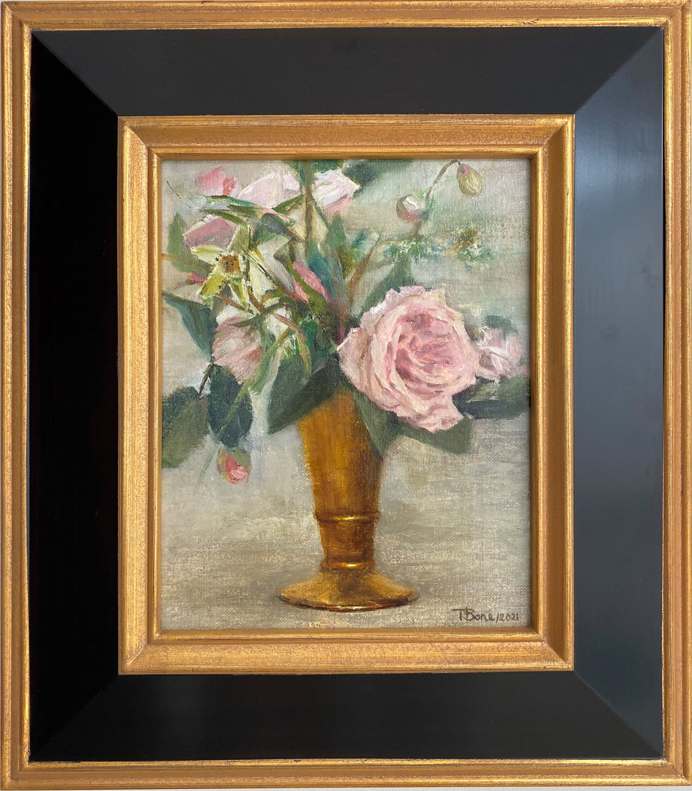 “The simplicity of Fantin-Latour’s compositions and masterly handling of cool interior light was my inspiration for this painting. I worked towards a strong value of light on the focal rose and at the same time, used the best of both worlds to support the focal point by employing similar close values and chroma where they serve well, but not necessarily in the same place.” – Tanya Bone