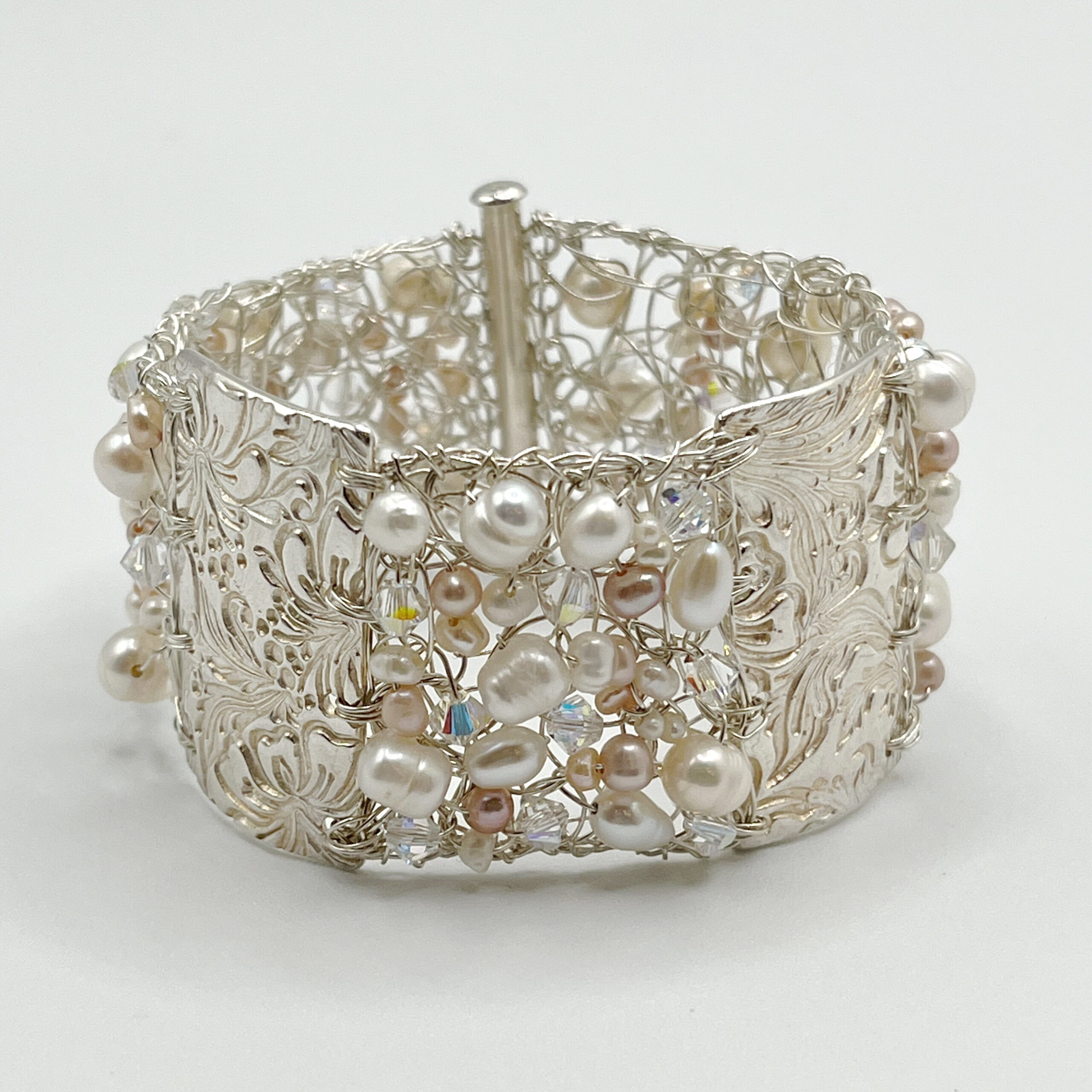 Fine Silver Crochet Cuff with Textured Bars, White and Pink Pearls, and Clear Swarovski Crystals by Veronica Stewart