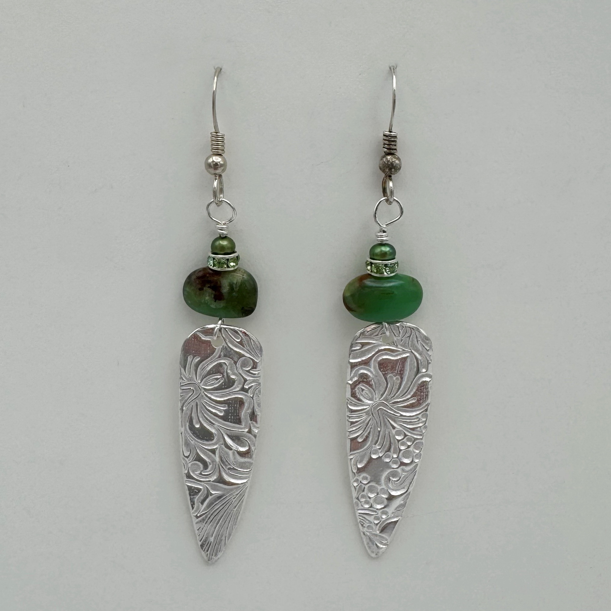 Fine Silver Textured Shields Earrings with Green Peruvian Opal by Veronica Stewart
