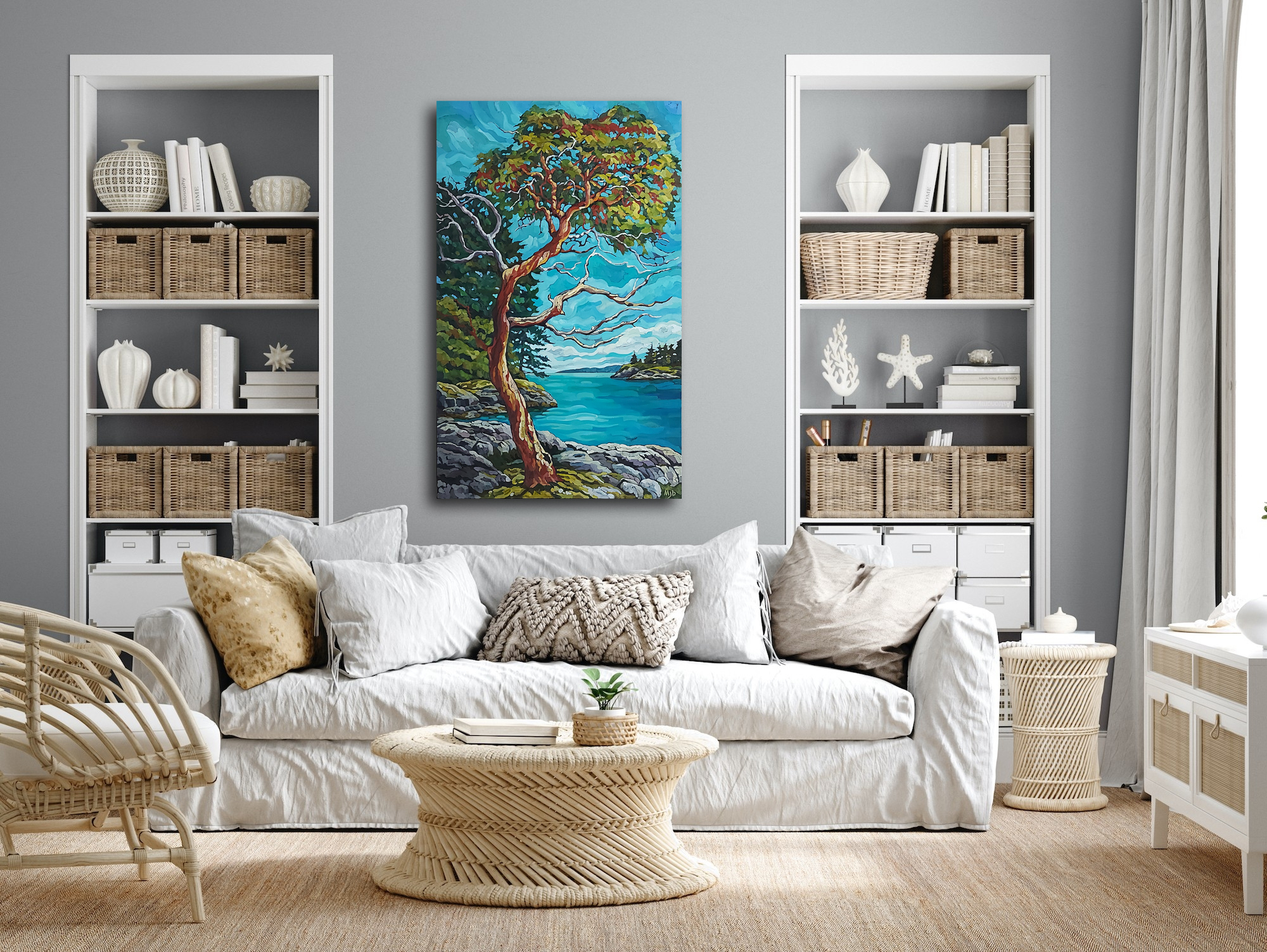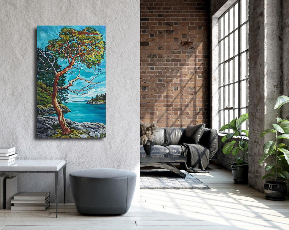 “Hidden Cove” is a painting that reflects what I love most about our southern British Columbian landscape; ocean, islands, and arbutus trees. I had the opportunity last summer to explore Desolation Sound by kayak. Experiencing the coastline this way, was truly magical and provided an intimate way to access the remote coves and bays. It was during this trip that I found my inspiration for “Hidden Cove”. – Mary-Jean Butler