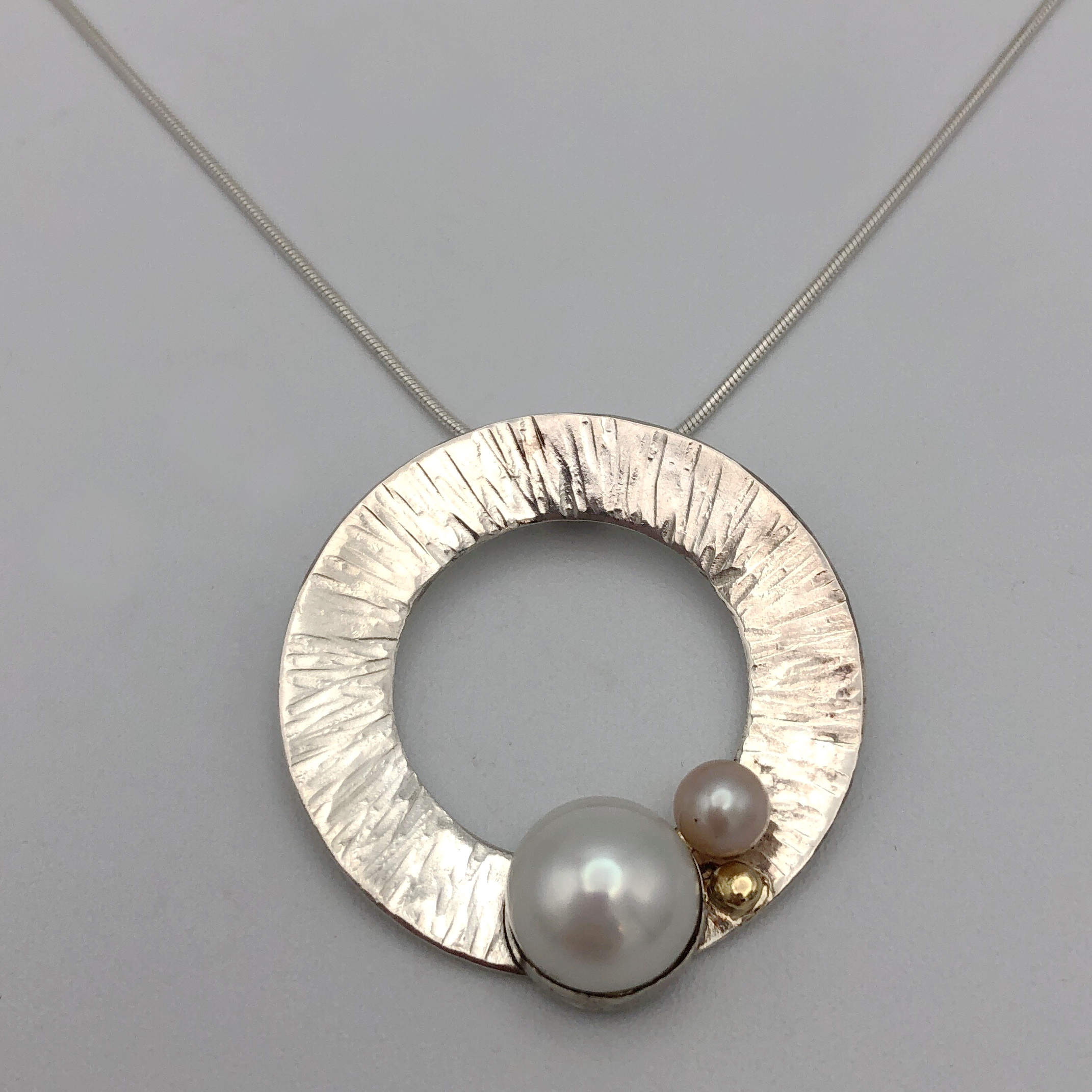 Large Hammered Silver Reef Pendant with Mabe White Pearl & Pink Pearl by Chi’s Creations