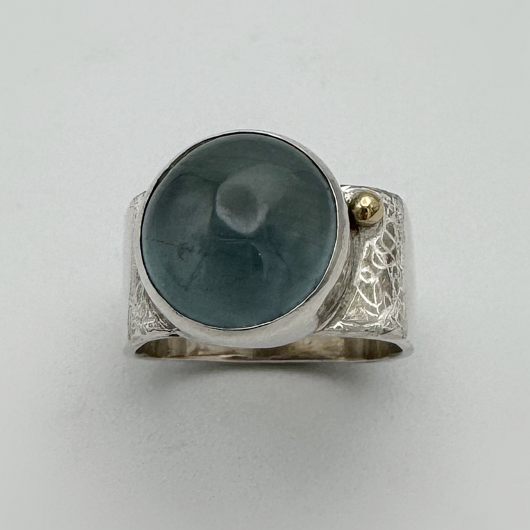 Sterling Silver, bezel set cabochon Aquamarine, 18kt. Gold