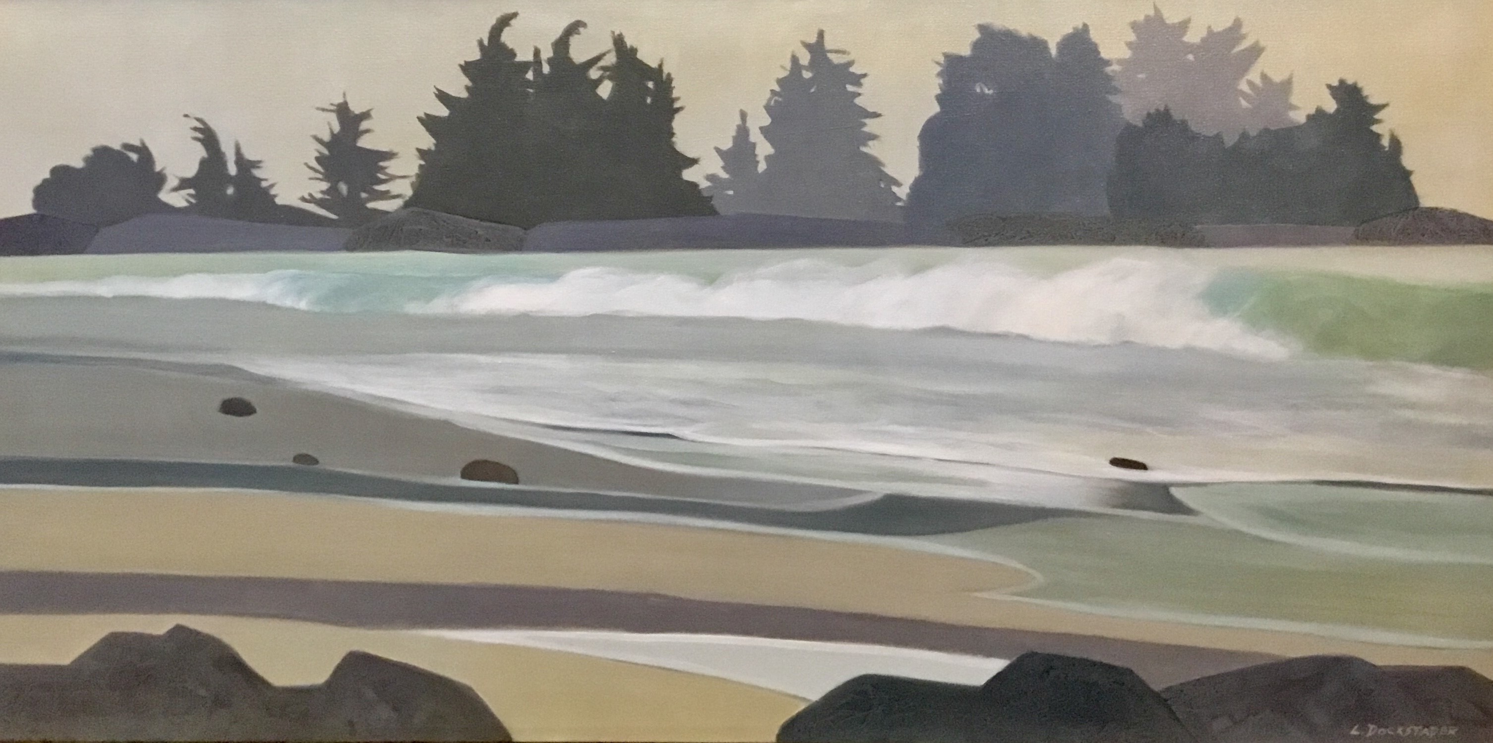 “Spending a quiet morning walking along the shore, I looked at all of the curves that developed and then disappeared. The edges of the trees in the mist, the waves as they rolled in, and the rocks and tide pools in the sand. I wanted to emphasize these linear elements, as well as a muted colour scheme to capture the coastal feeling of that September morning.” – Lorna Dockstader