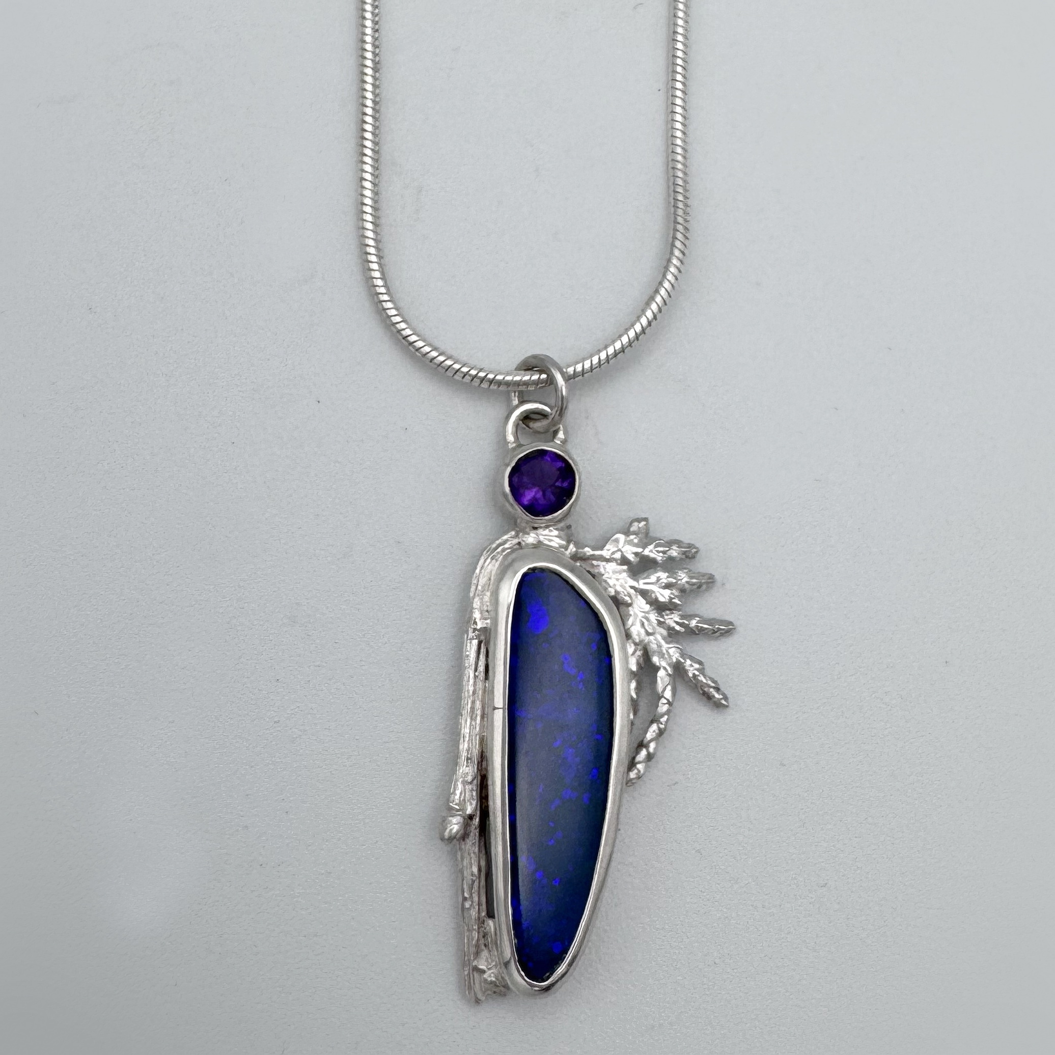 Sterling Silver cast juniper sprig and twig, Opal doublet, Amethyst