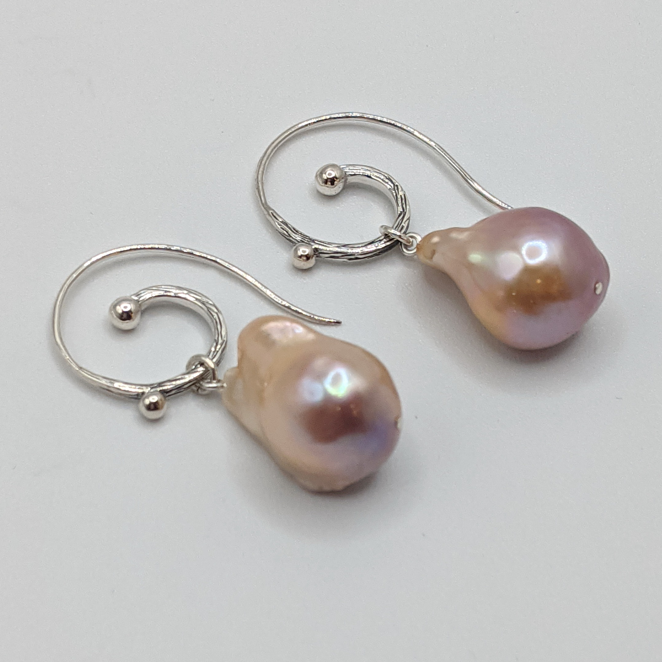 Pink Baroque Pearl Earrings with Hammered Sterling Silver Curled Wire by Val Nunns