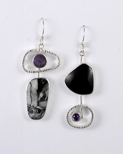 Pinolith, Black Jade, Purple Jade and Amethyst Earrings by Brenda Roy