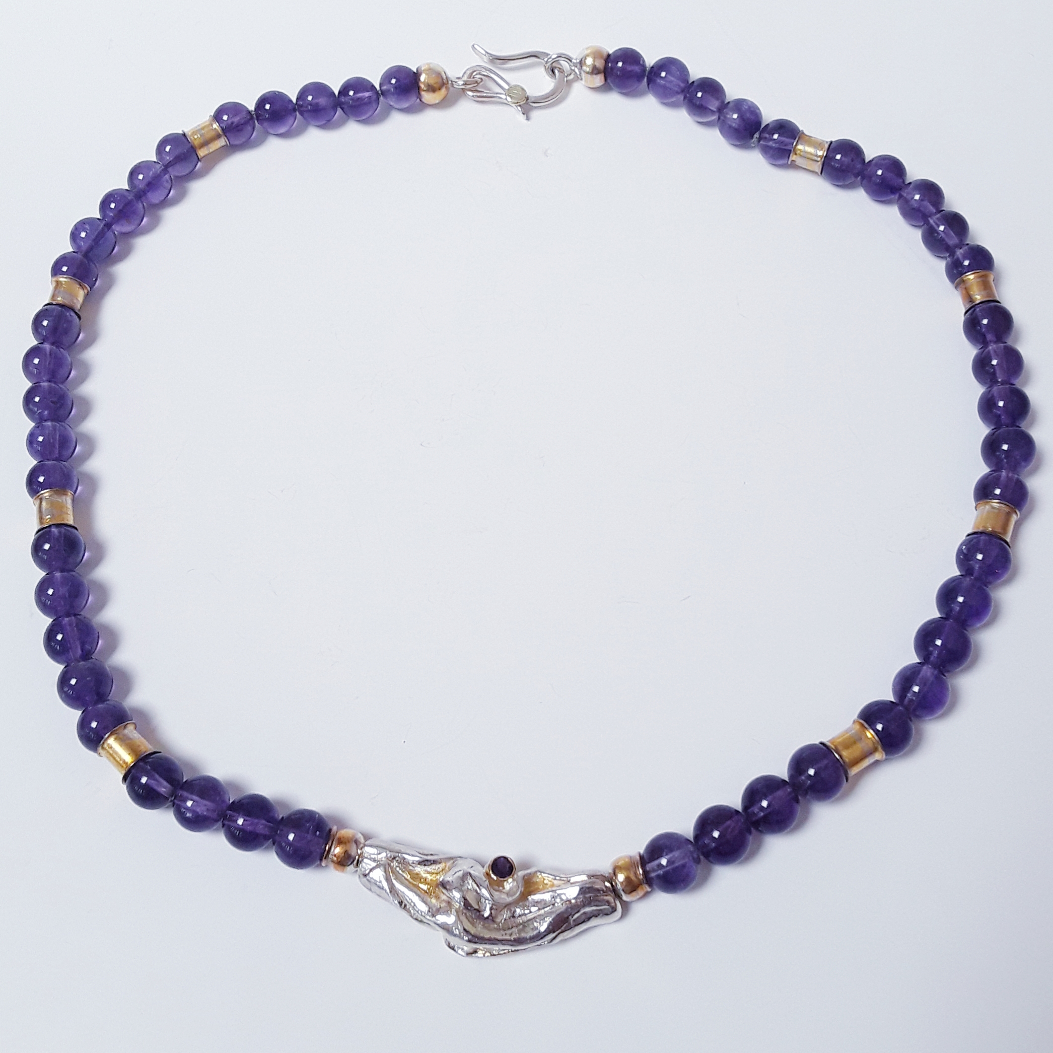 Sterling Silver, KeumBoo (pure gold, fused), Amethyst beads, Amethyst set in 18kt. Yellow Gold