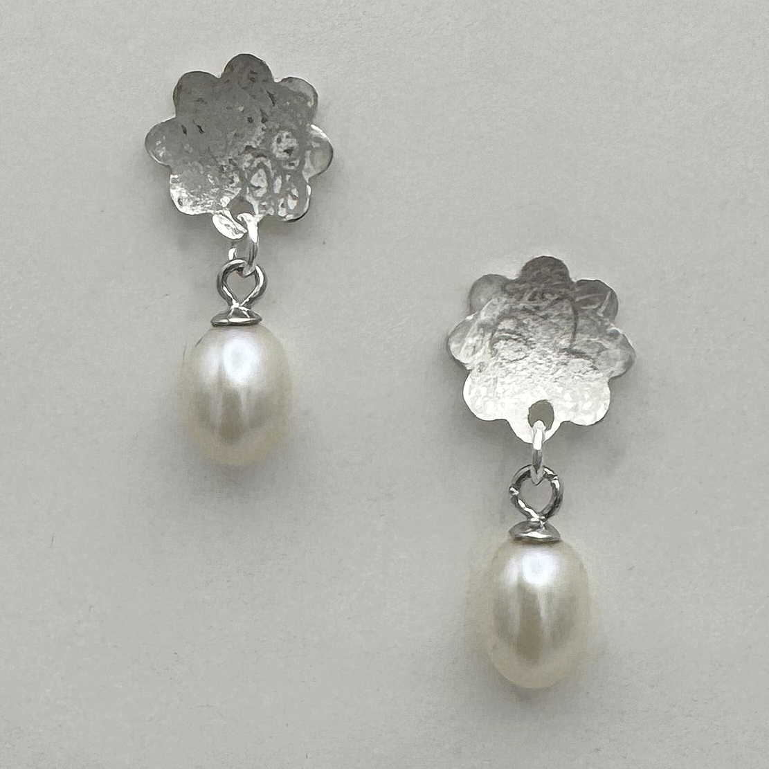 Scribbled Flower Stud Earrings with White Pearl Dangles by Chi’s Creations