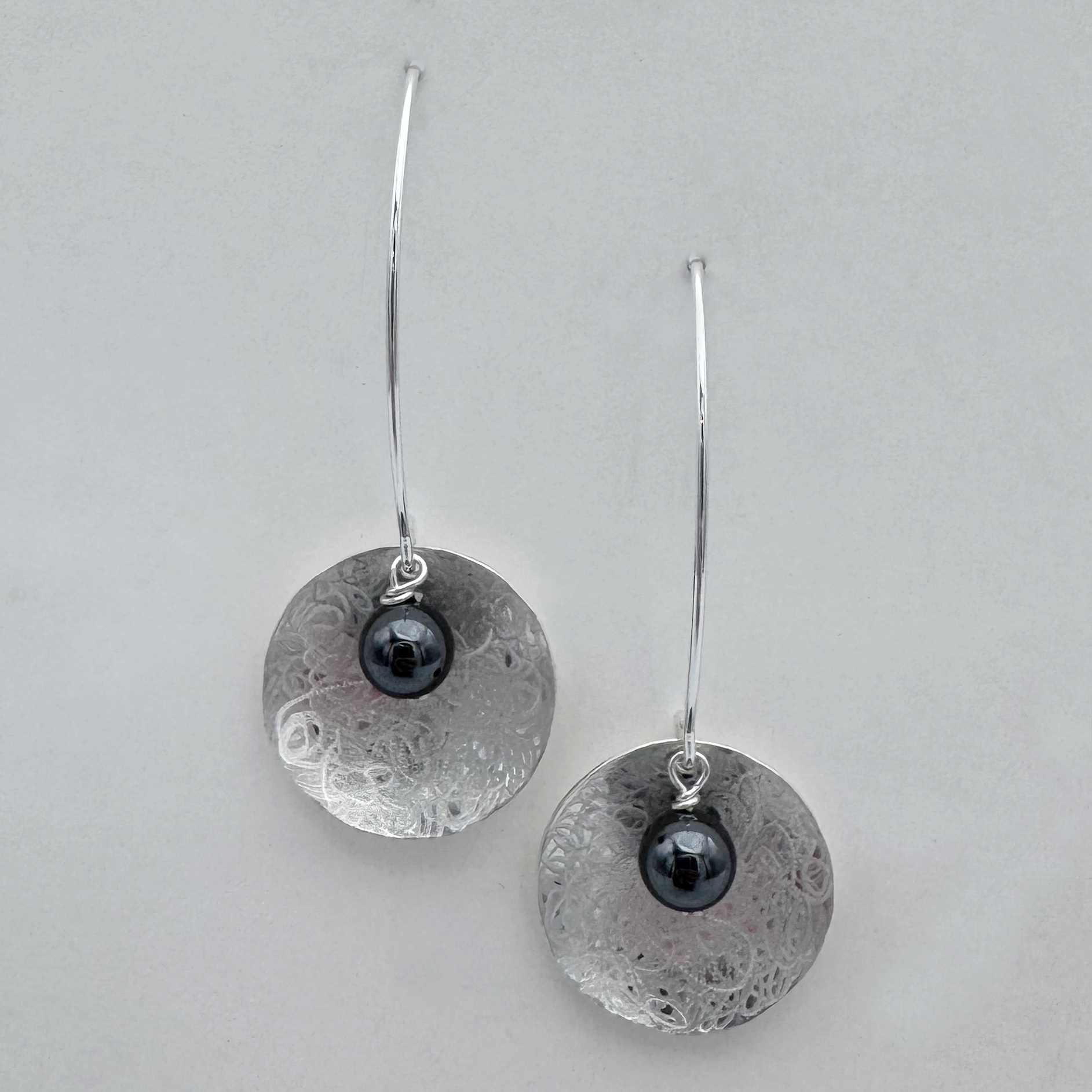 Scribbled Shell Disc Earrings with Hematite by Chi’s Creations