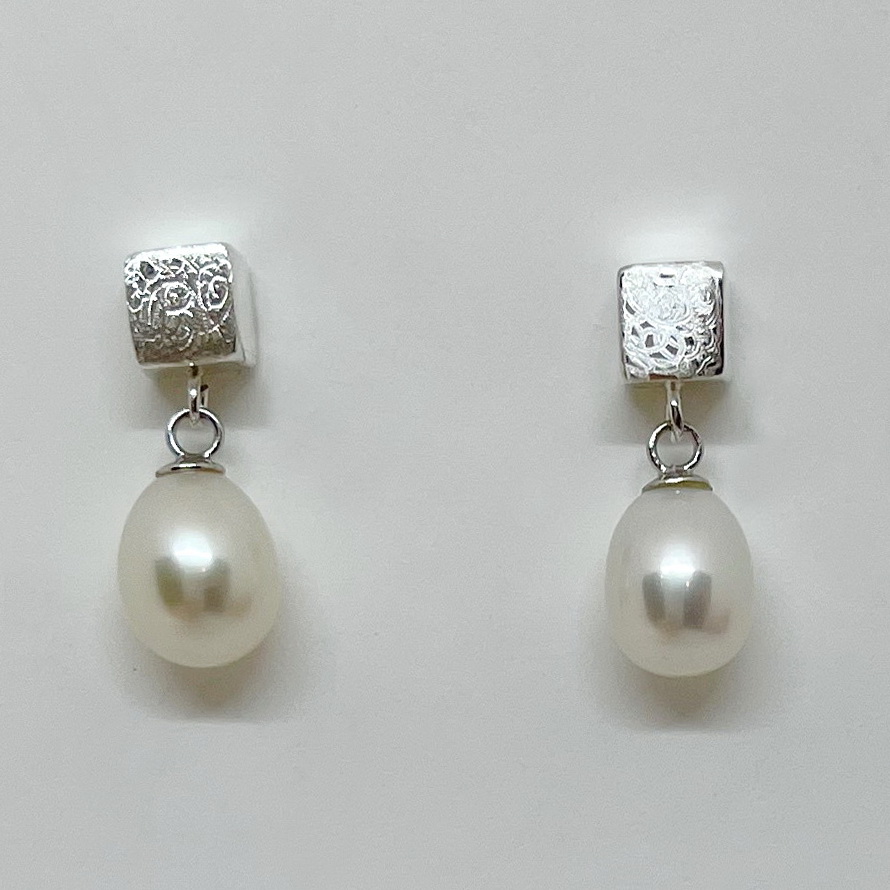Scribbled Square Cube Stud Earrings with White Pearl Dangles by Chi’s Creations