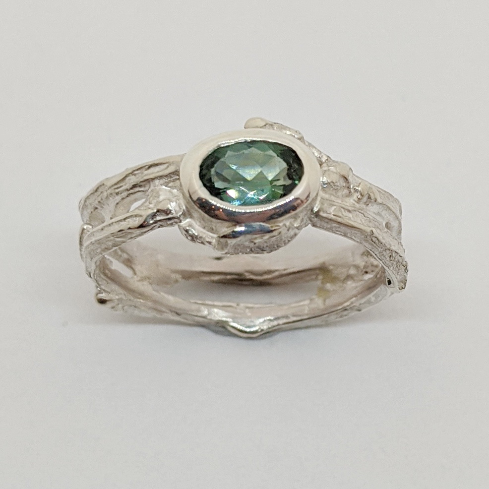 Teal Tourmaline, Sterling Silver cast twigs, Fine Silver bezel