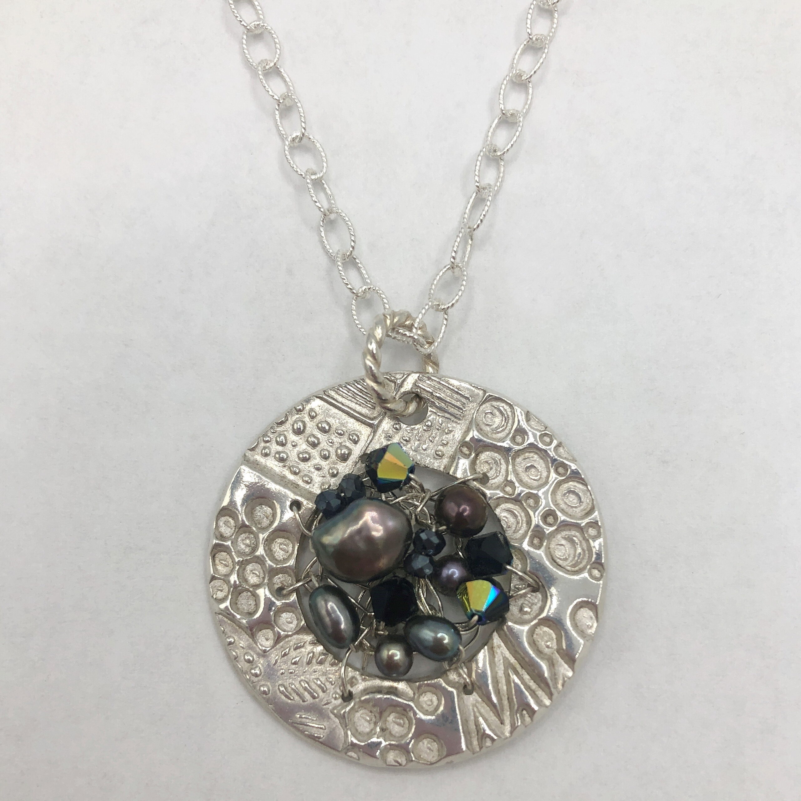 Fine Silver, Black Swarovski Crystals, Grey Pearls, Sterling Silver chain