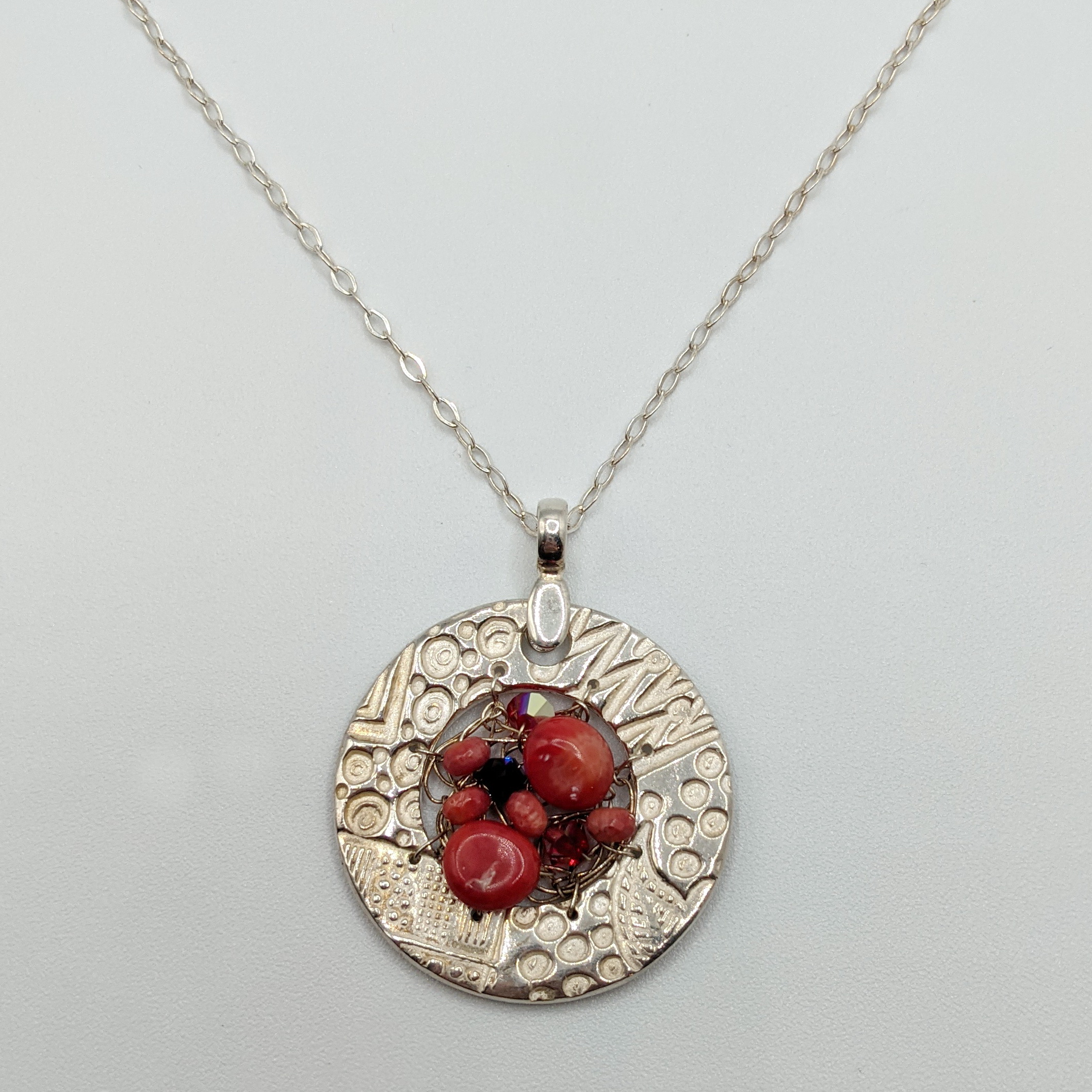 Small Round Textured Pendant with Red Coral & Swarovski Crystals by Veronica Stewart