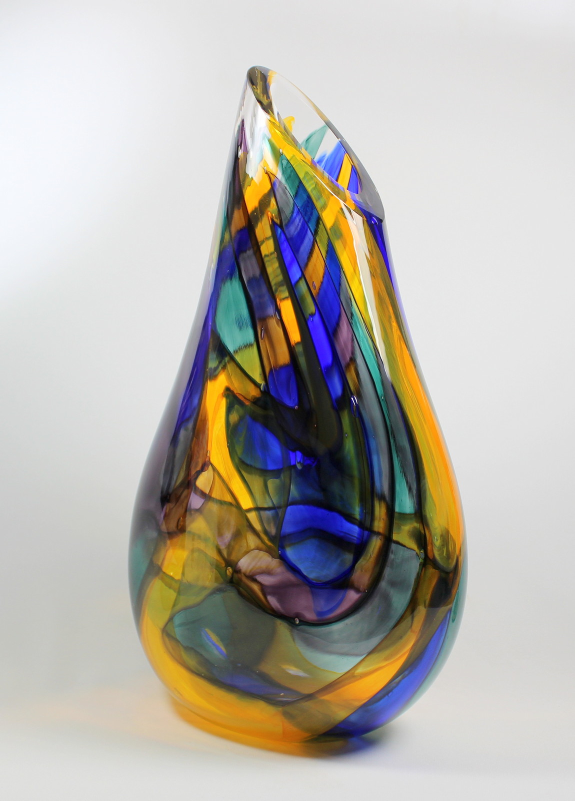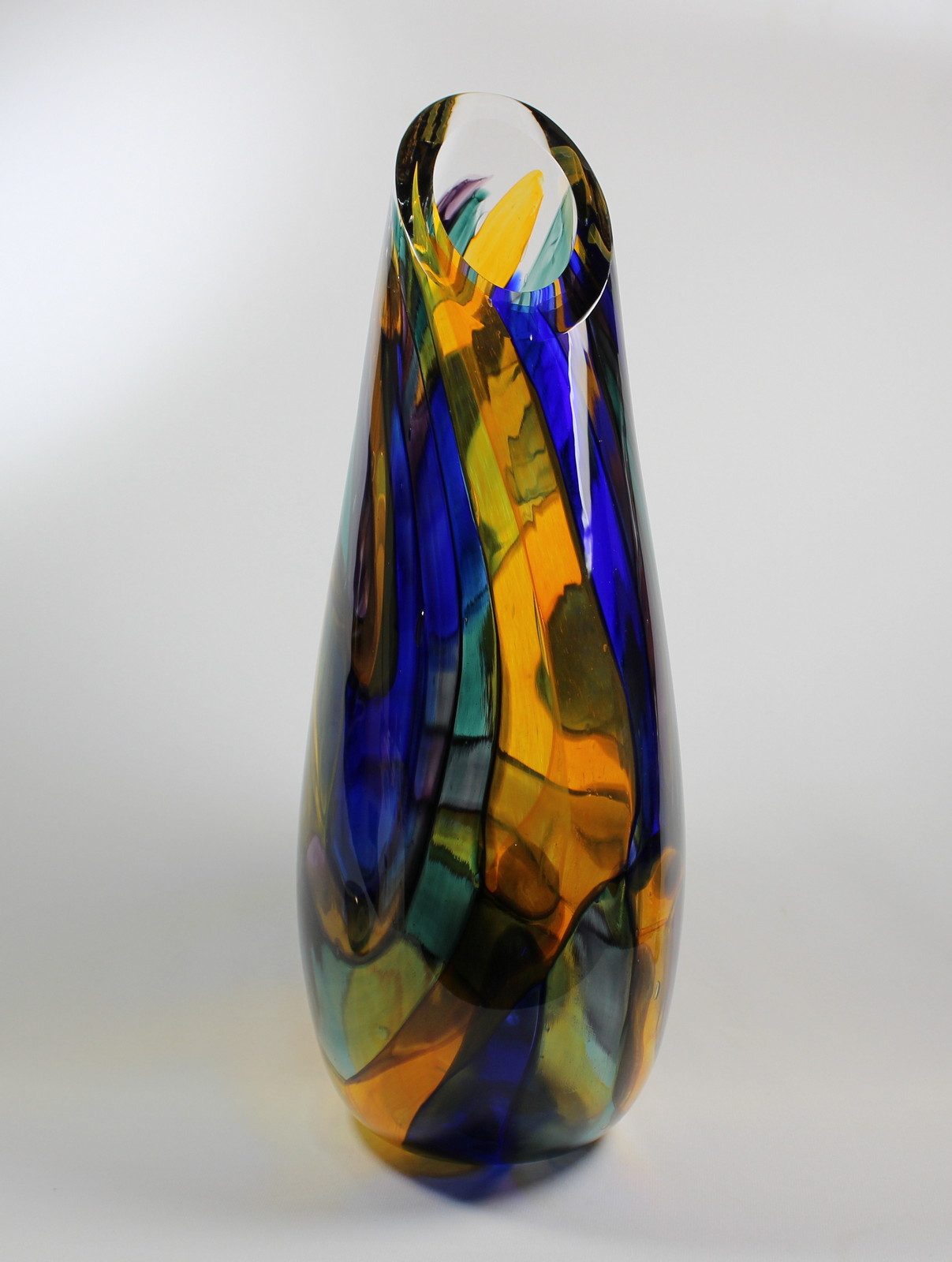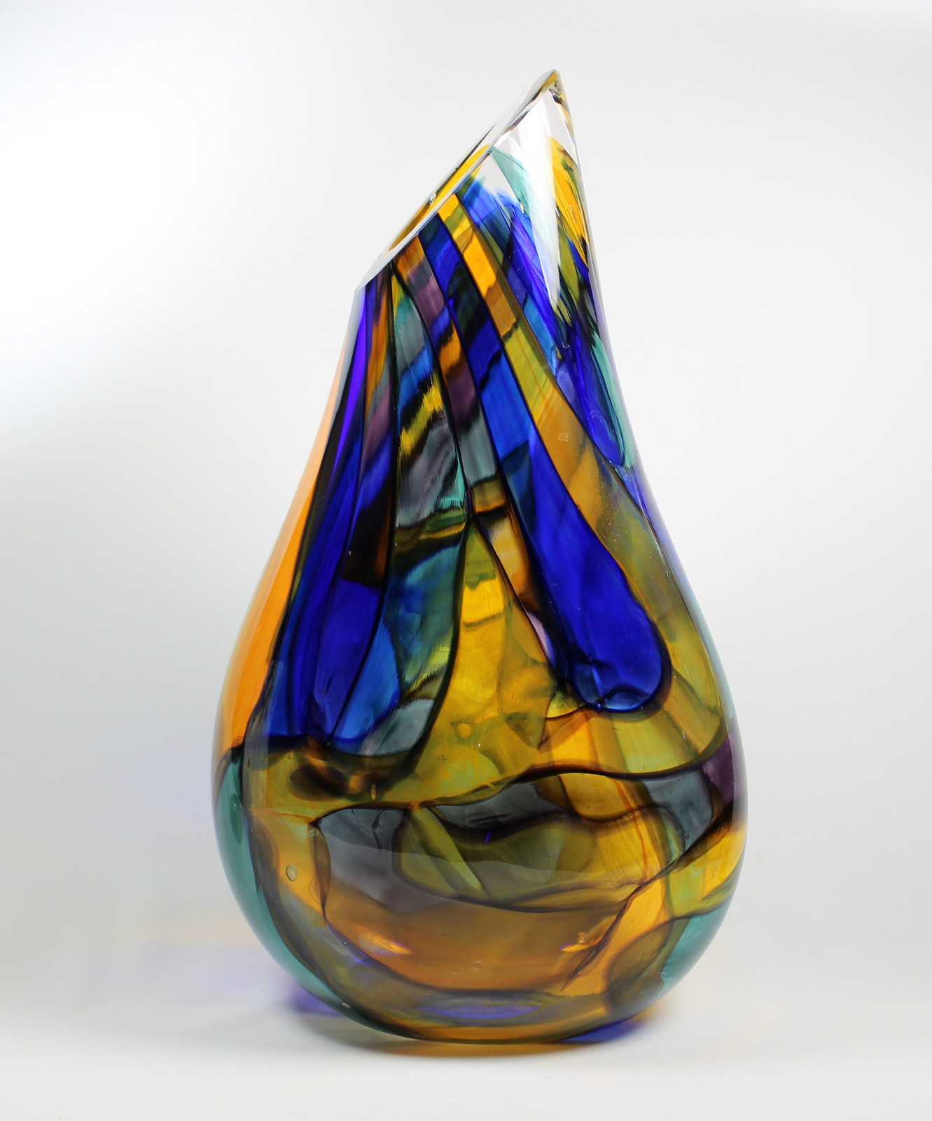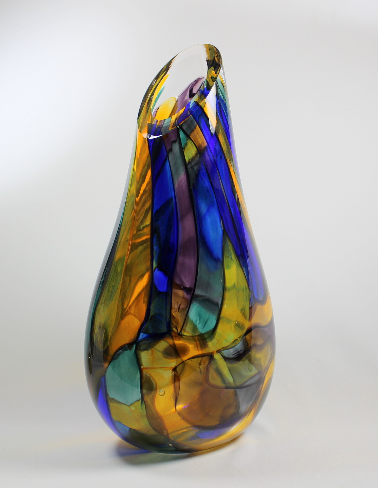 “This piece brings distinct colours together and creates significant additional hues as the colours intermix and mingle. Best displayed where sunlight can reflect and refract through the vessel creating additional interplays of light in its shadow.” – Guy Hollington