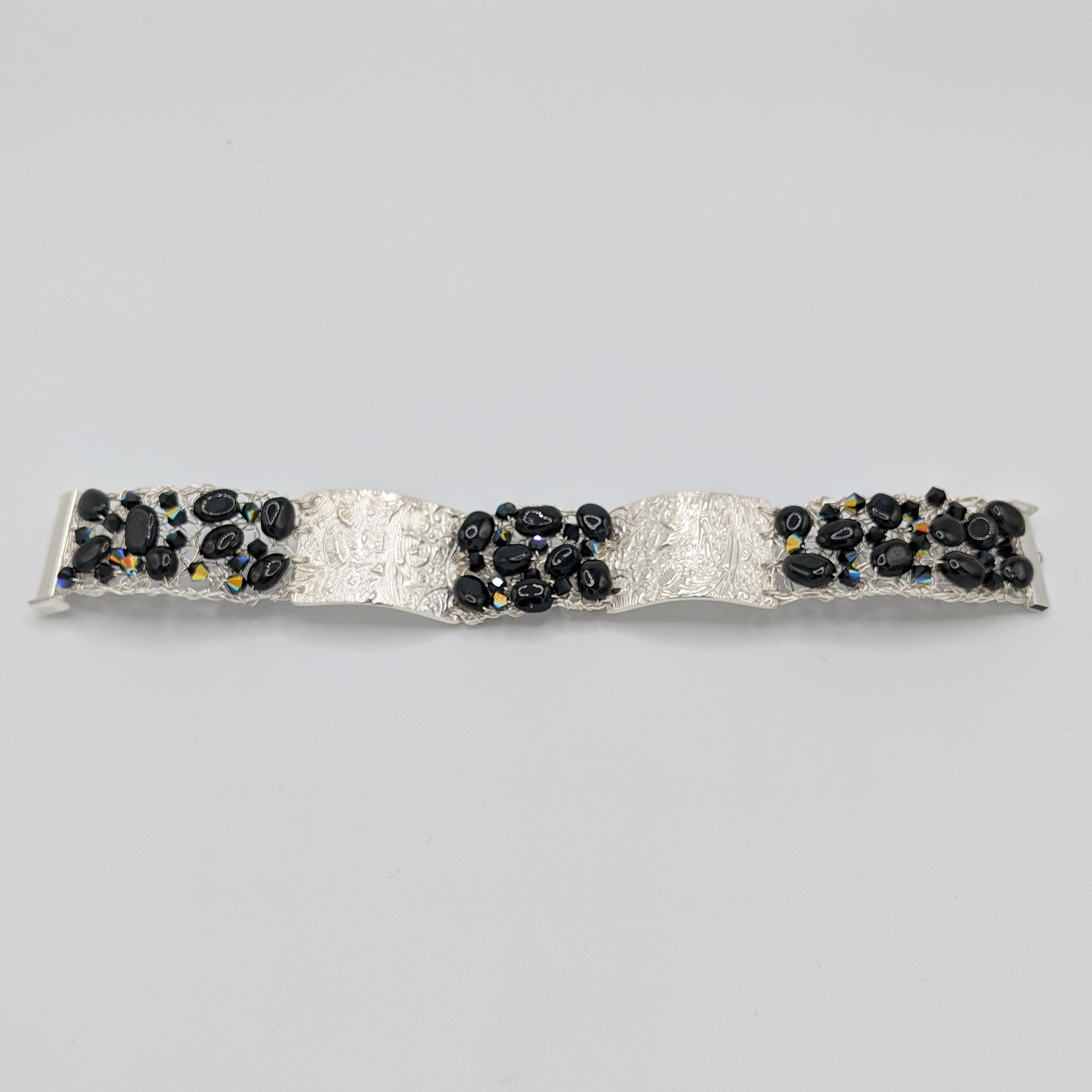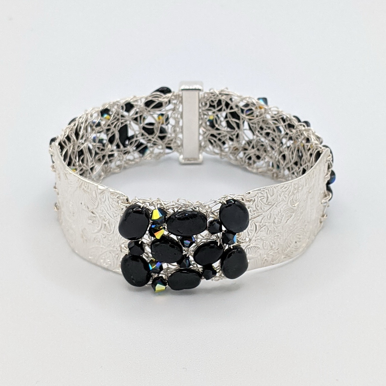 Textured Silver & Crochet Cuff with Onyx & Black Swarovski Crystals by Veronica Stewart