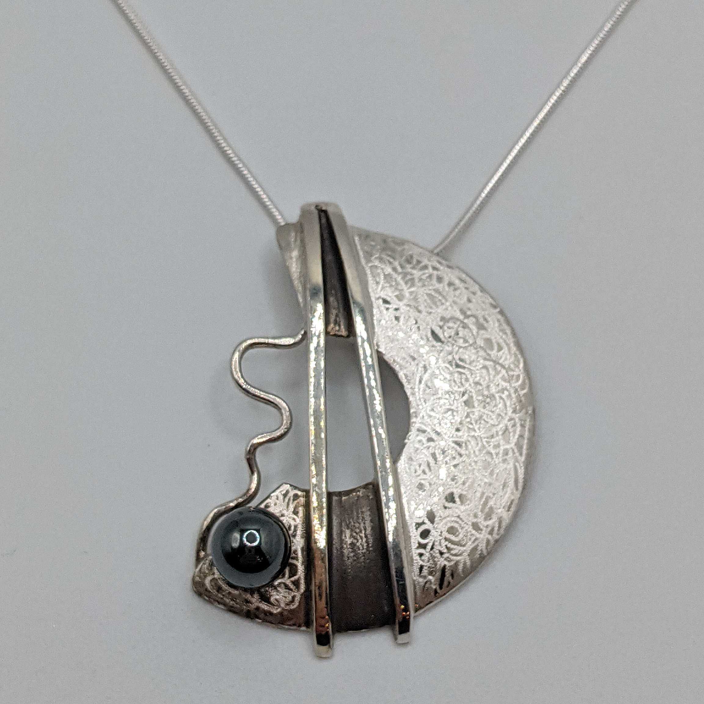 Oxidized Scribbled Textured Sterling Silver, peg set Hematite Bead
