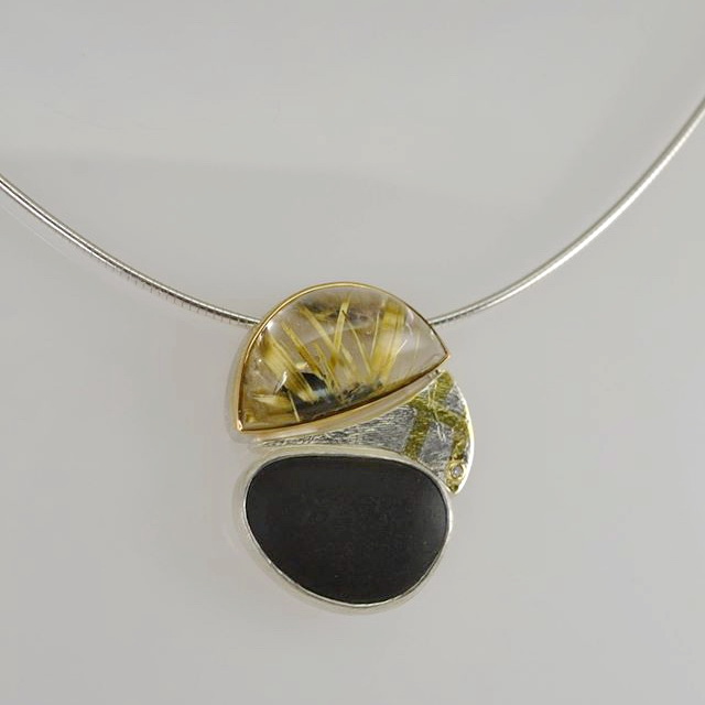 Sterling silver, 18 kt gold, 0.03 ct. diamond, black pebble stone, top quality Brazilian Quartz, comes with sterling silver chain.