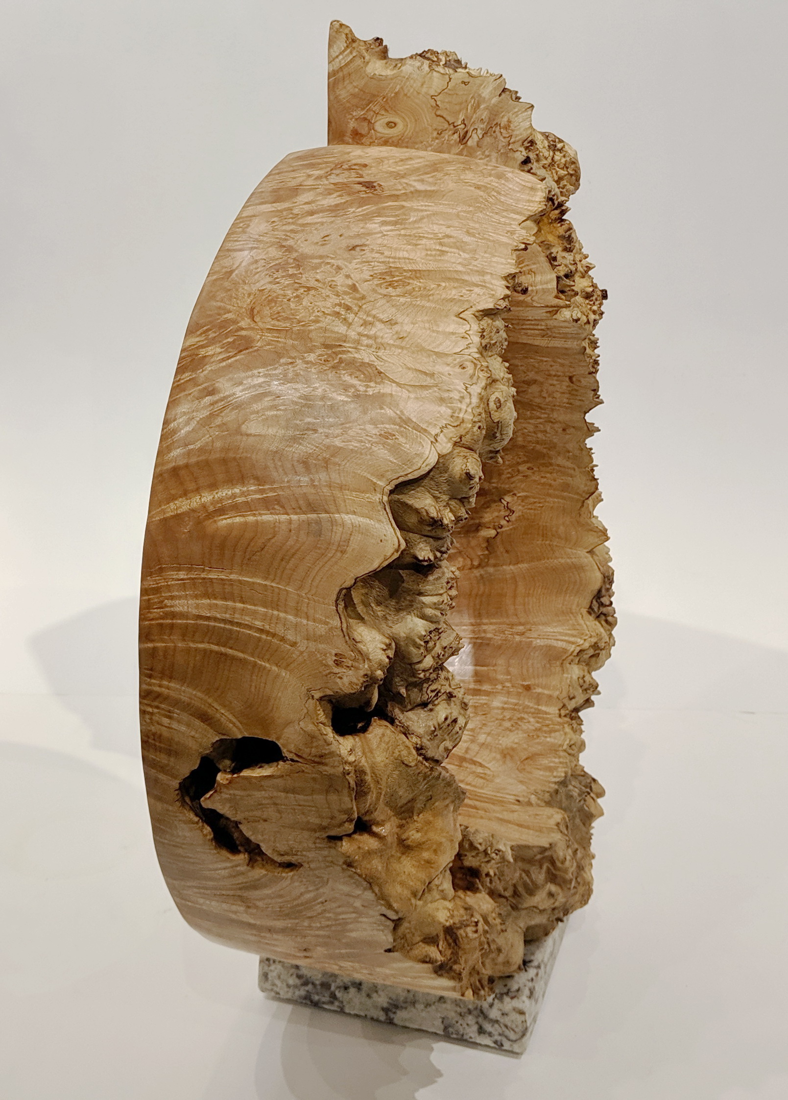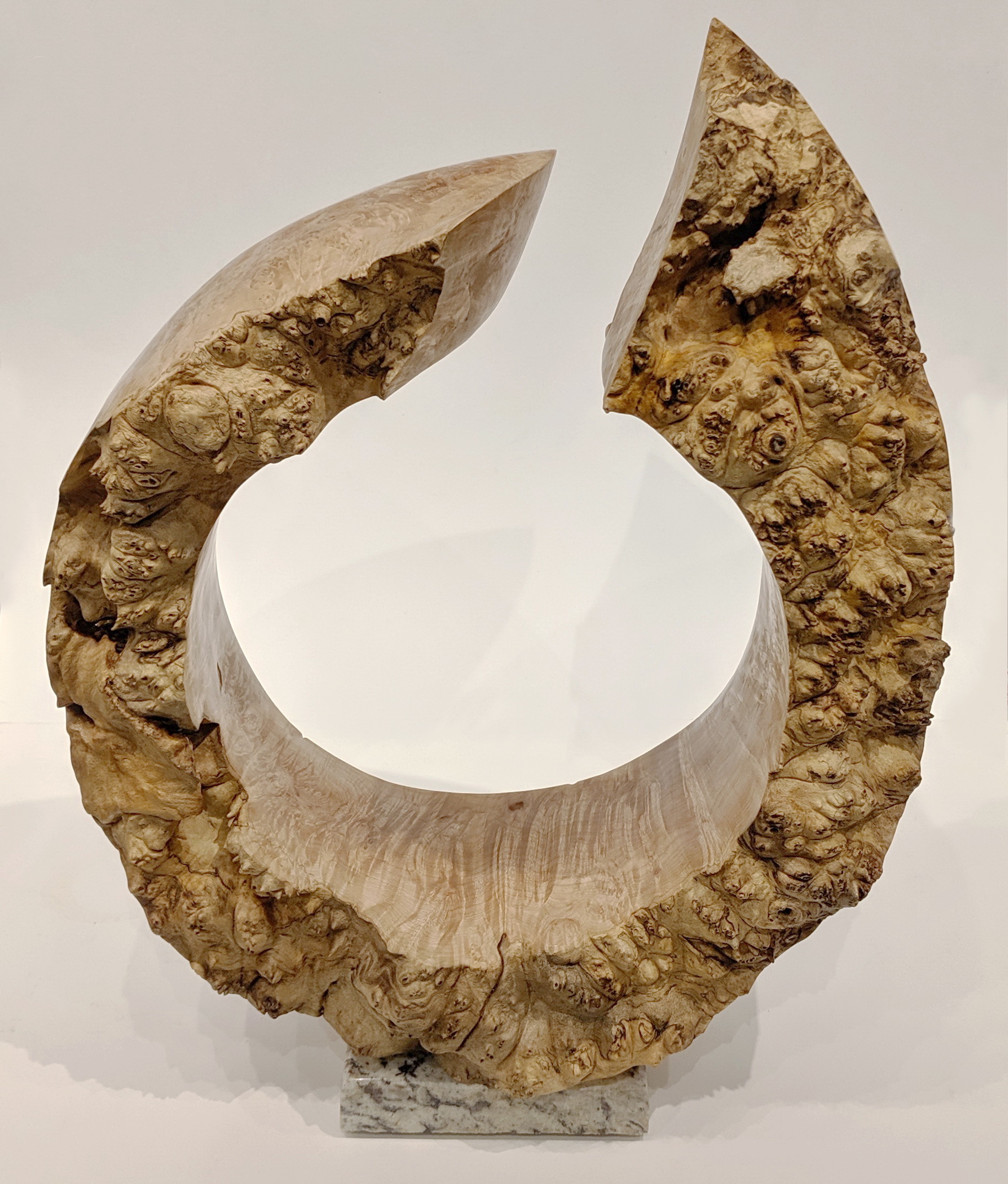 Wedding Band is an example of trying to illustrate a very human concept – marriage – that uses an elemental natural shape – the circle – with a rare natural product, the burl. The burl is particularly suited as the whorls of the bird’s eye grain reflect the circular design. The live-edge, which challenges the smooth round man made ring, the gap where the circle is incomplete, and the imperfections inherent in live-edge sculpture, reflect the tension and challenges inherent in the very human need to couple and join in marriage. – Bruce Edmundson