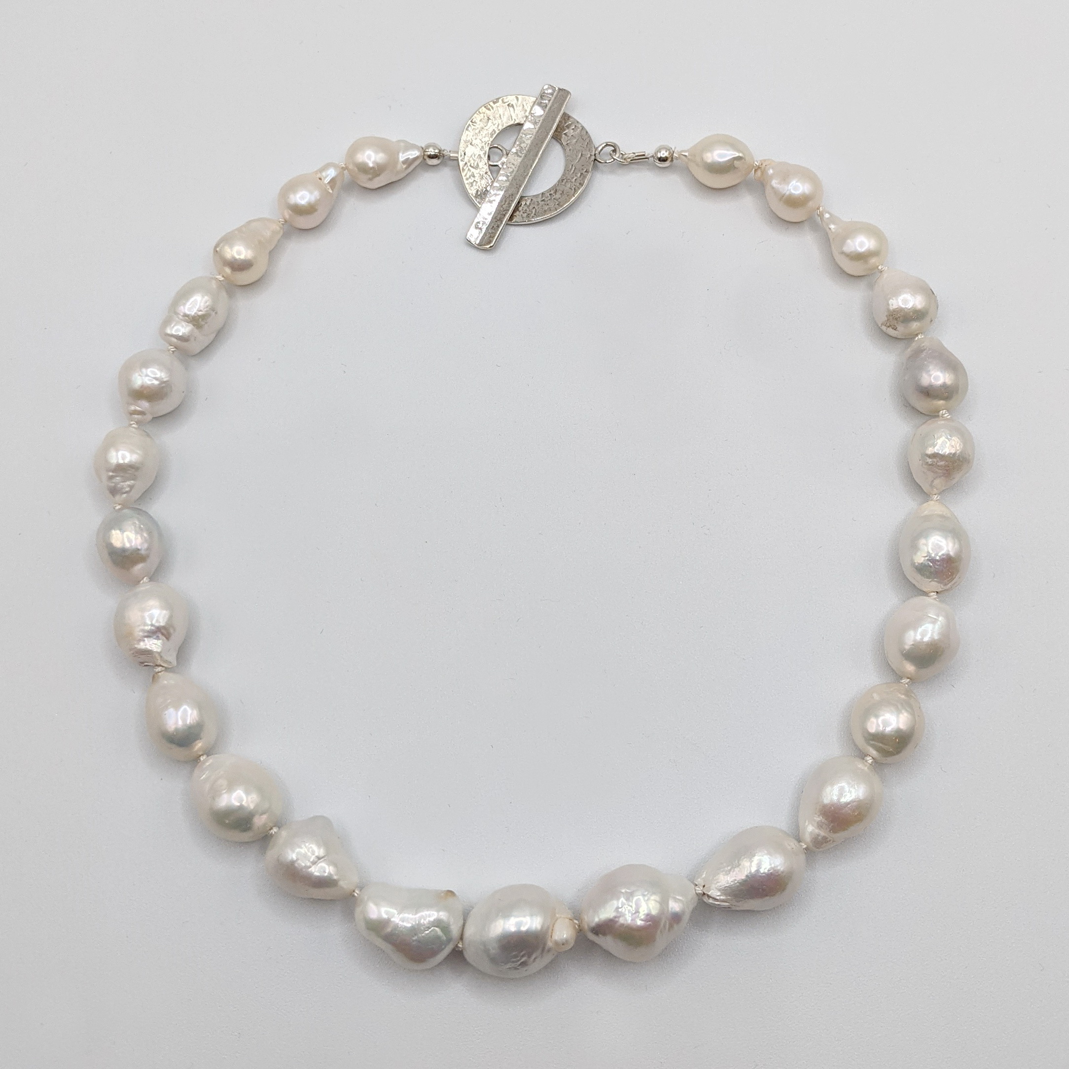 White Baroque Freshwater Pearl Necklace with Hammered Sterling Silver Toggle Clasp by Val Nunns