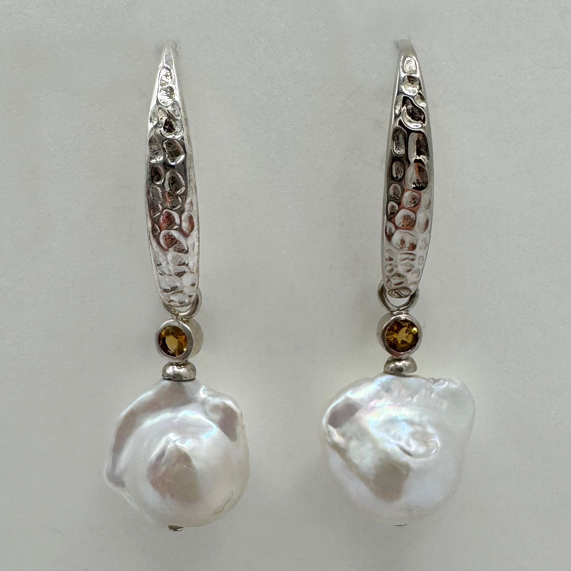 Sterling Silver Hammered Wires, White Baroque Pearls, Citrine