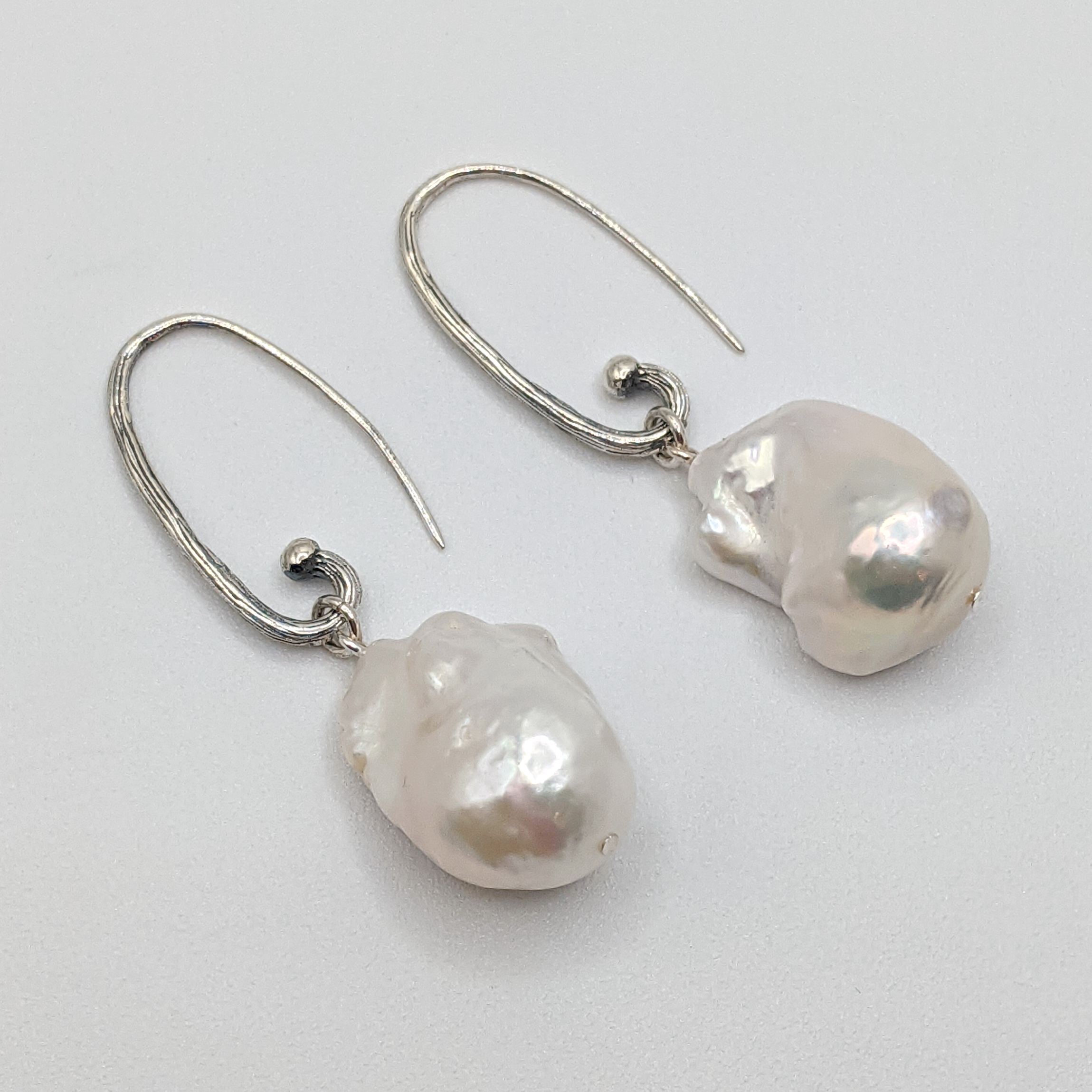 White Baroque Pearl Earrings with Oval Hammered Hoops by Val Nunns