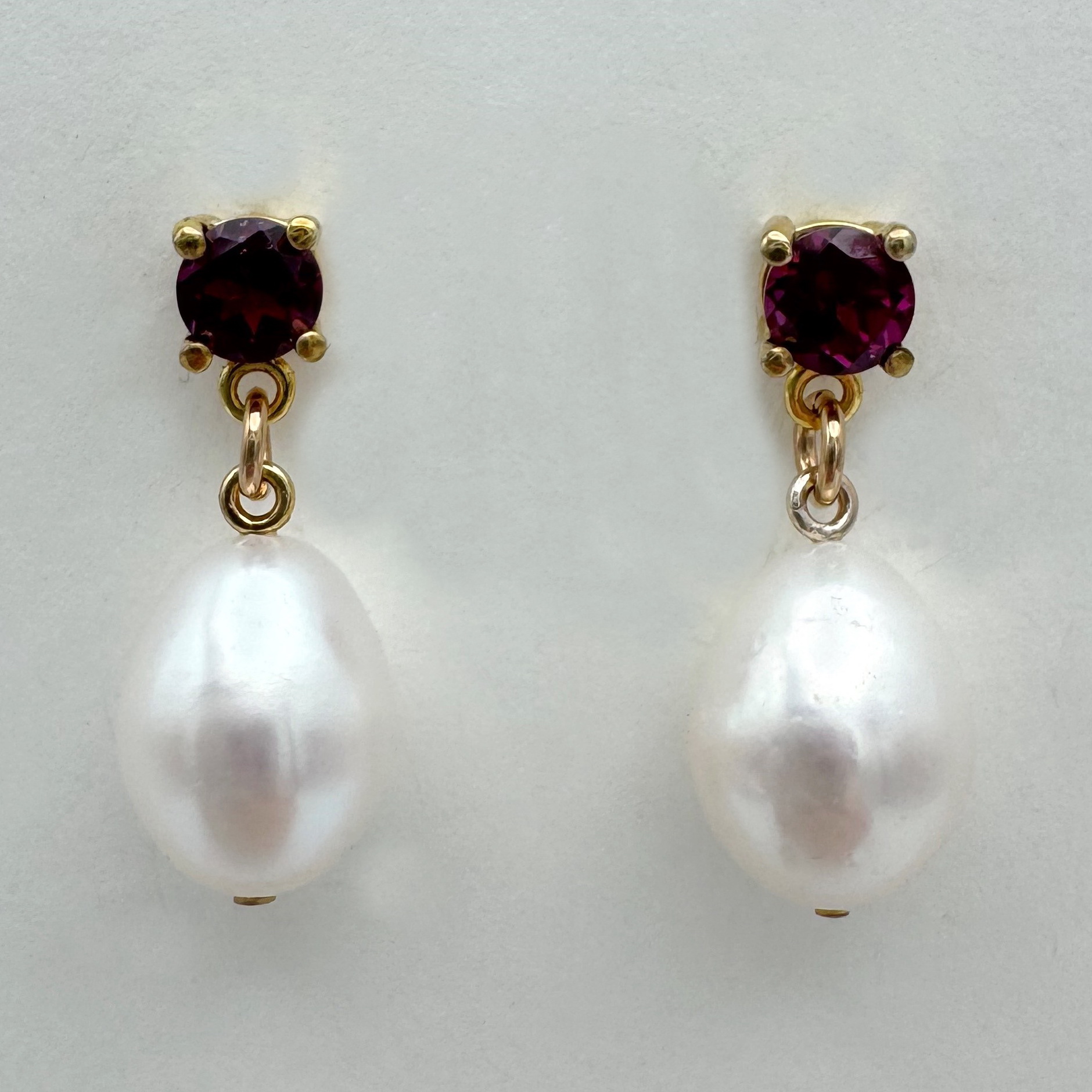 White Freshwater Pearl & Raspberry Garnet Earrings by Val Nunns