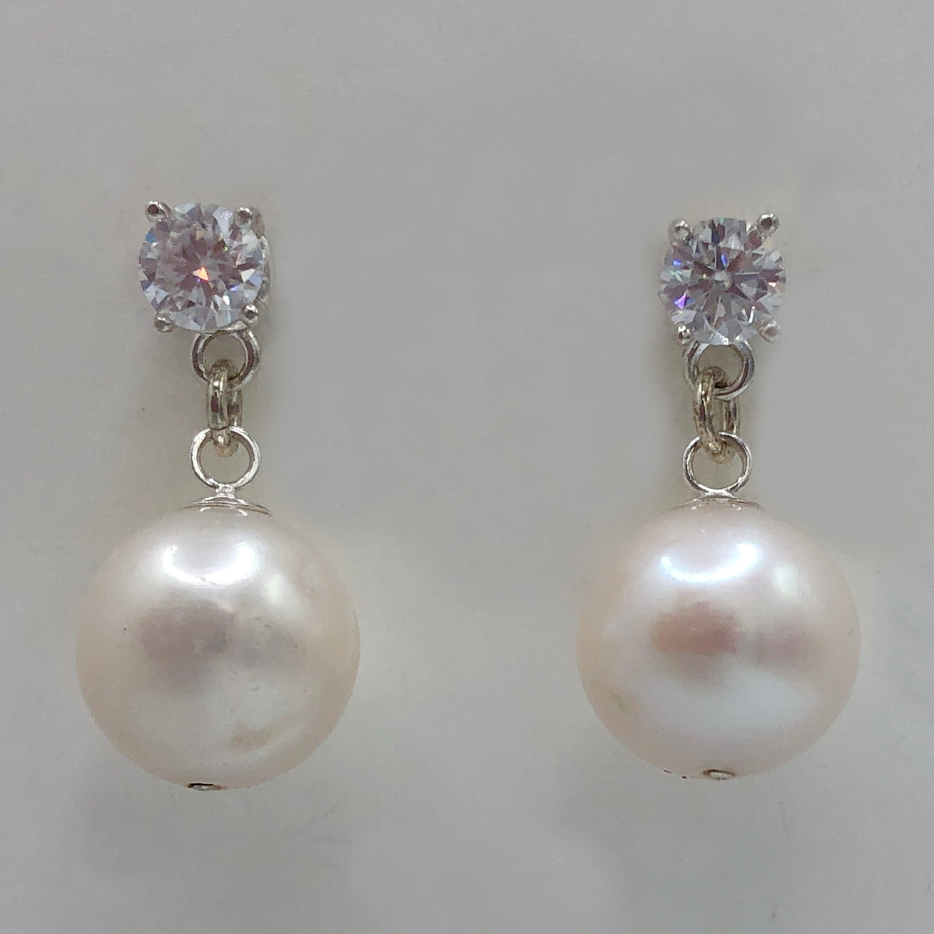 White Round Pearl & Lab Grown Diamond Earrings by Val Nunns