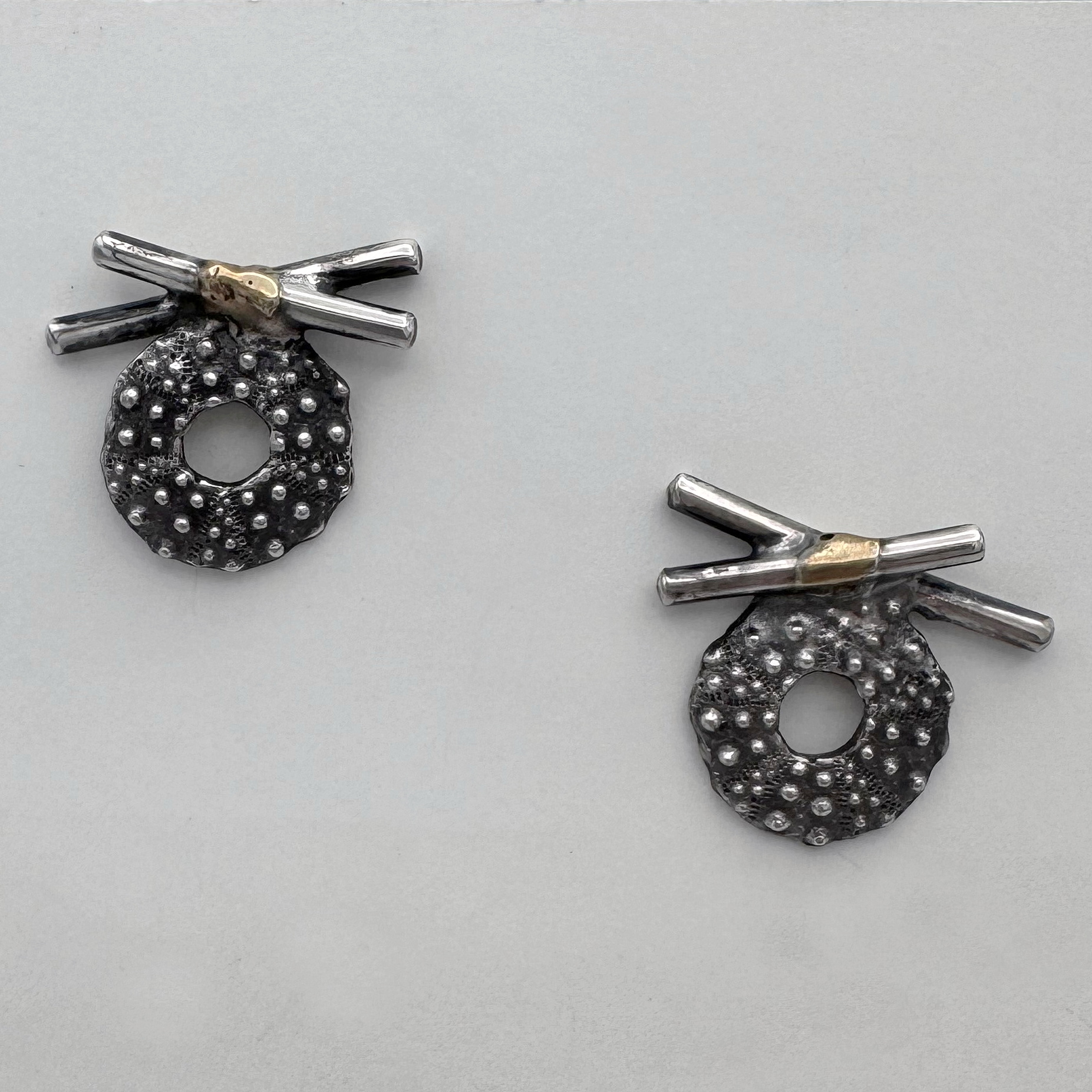 Patinated sterling silver (cast sea urchin sections), fused 14k gold plated in 24k gold for intensified colour