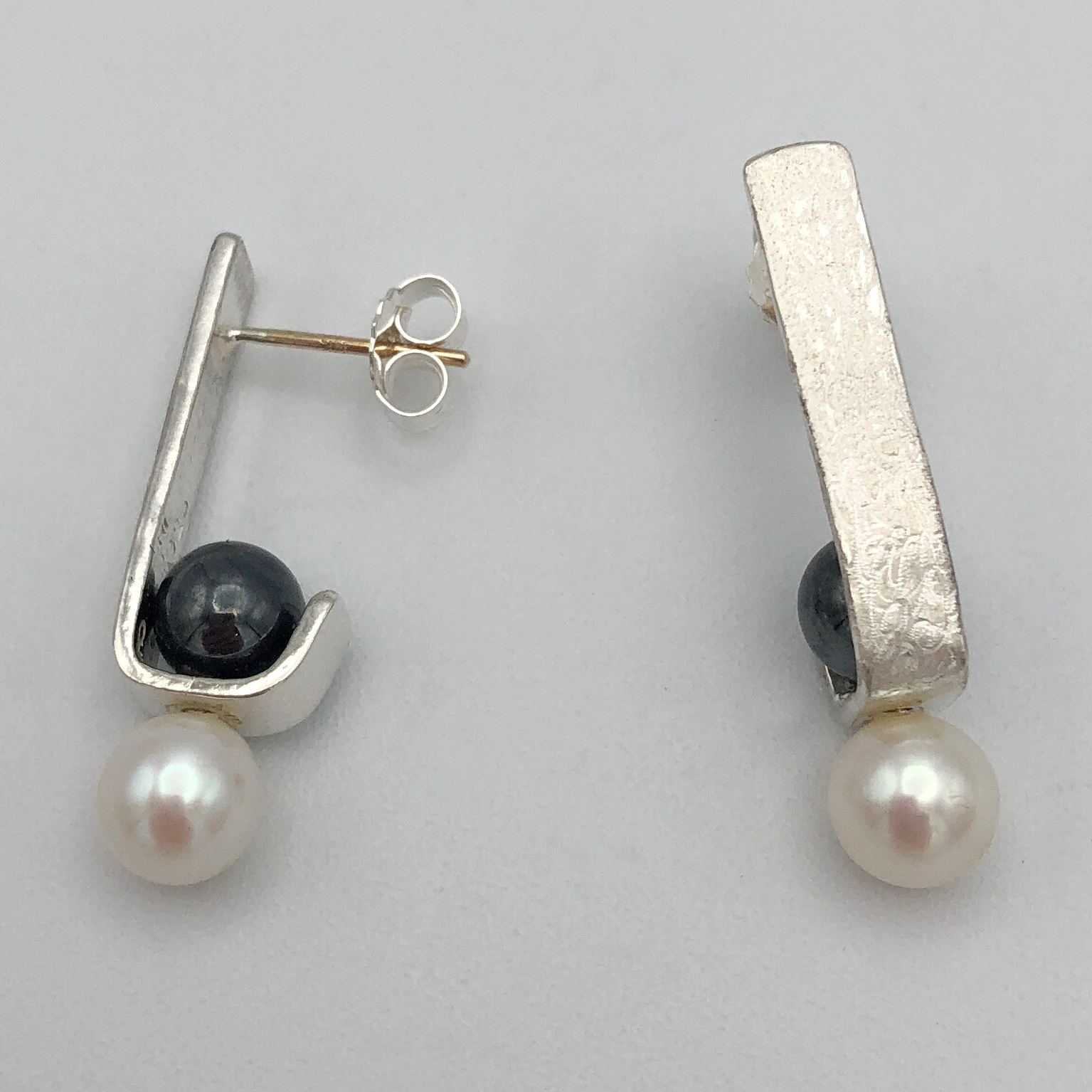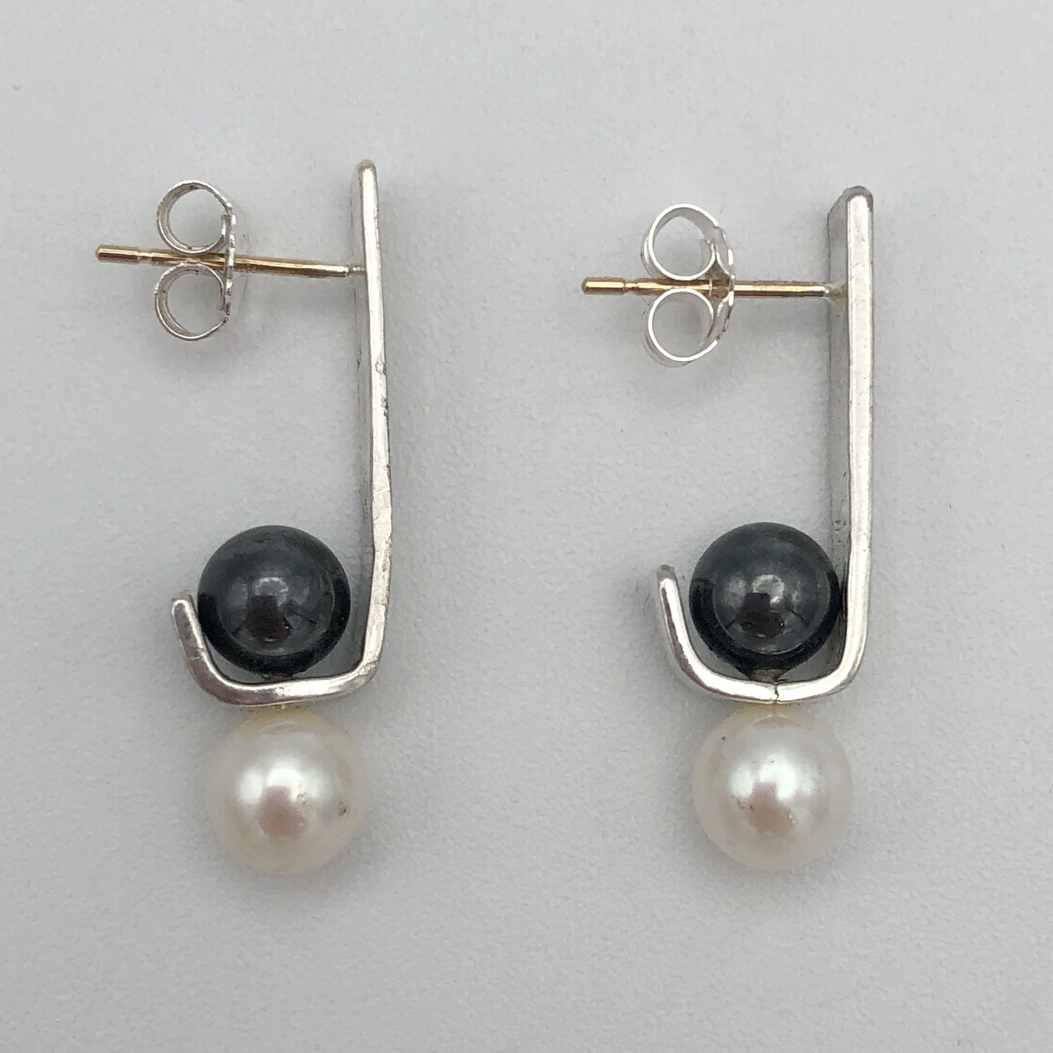 Sterling Silver, Hematite, White Pearls, 14kt. Gold Earring Posts