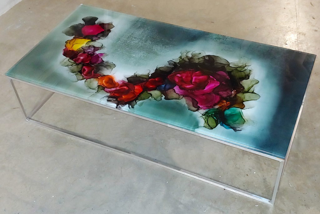 Acrylic and ink on 12mm starphire glass, hand polished 12mm aluminum base