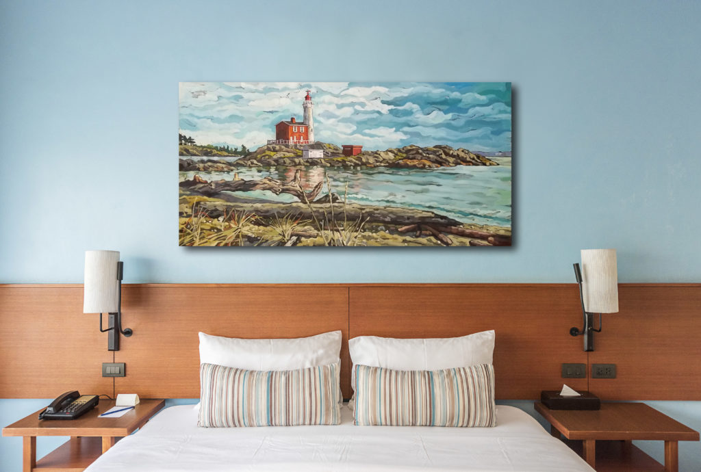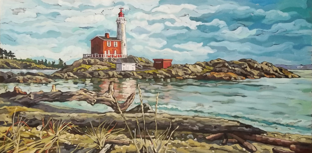 Last summer I spent time exploring the area around Fort Rodd Hill. On this particular day I was struck by the soft golden light cast on the beach and grasses in the foreground. The lighthouse stood as a beacon with its bold red tones illuminated against the soft palette. – Mary-Jean Butler