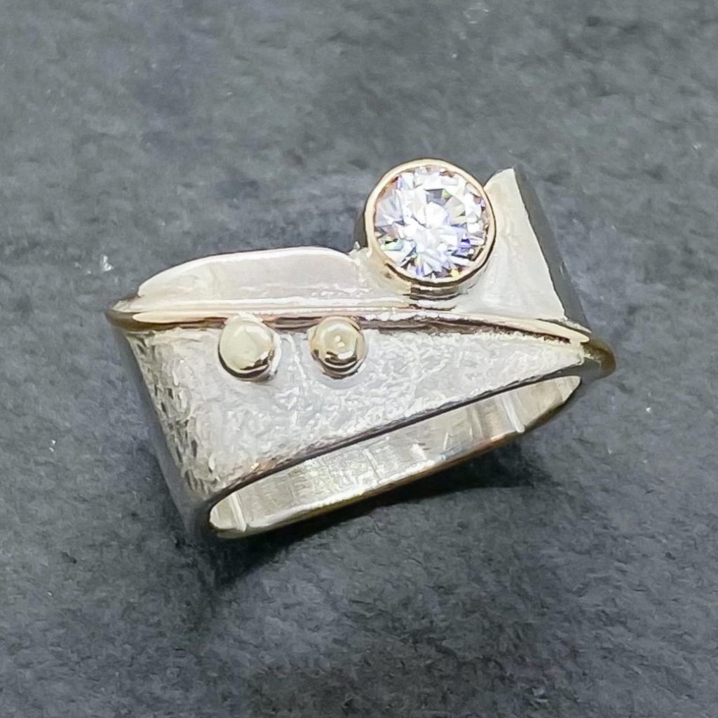 My aim is to create a story with each of my designs to spark a conversation that mirrors a personal experience, family story, memory or inspiration that lies embedded in my jewellery. I am intrigued by coloured, interesting gems placed in juxtaposition to a carefully chosen texture combined with a design application like foldforming that complete an original design. My inspirations often come from my travels, nature and art that have influenced me throughout a design finding process. – Andrea Roberts