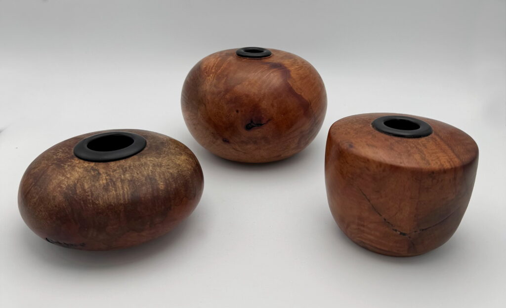 Hollow Forms Arbutus Burl, Ebony, sizes vary Left to right: $1140, $175 and $110