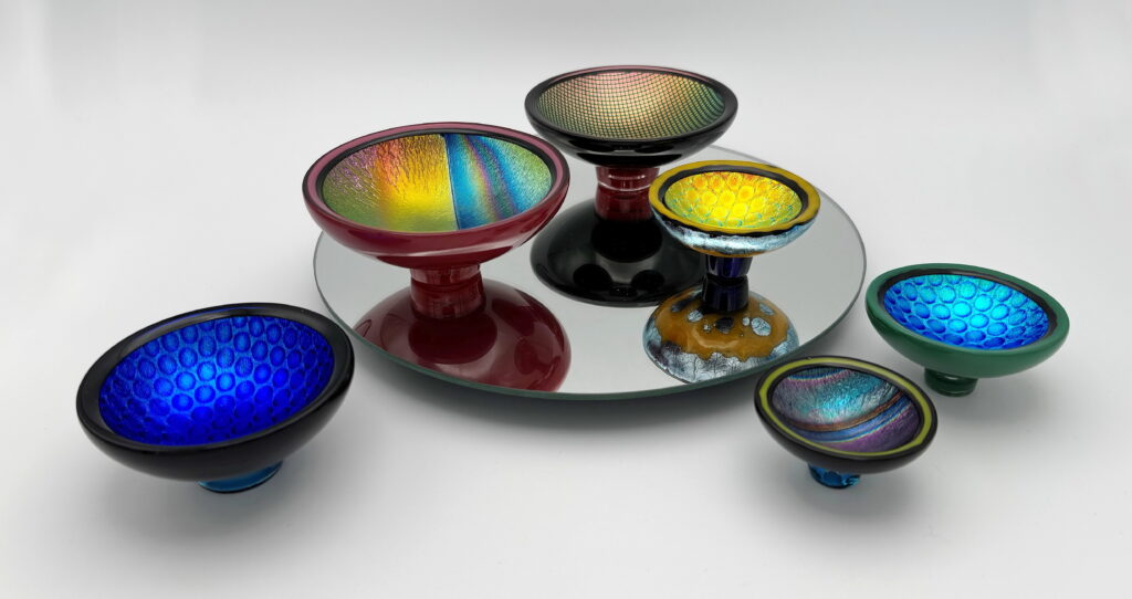 A new collection of Jo’s iridescent dichroic glass “ToBs” (Things of Beauty) have arrived! The creation of these jewel-like works of art is Jo’s passion.