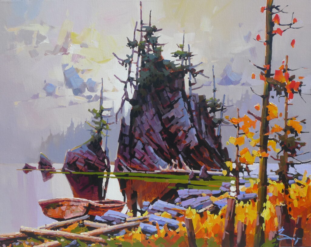 Based directly on a 12×12” painting I did on location, Rising & Falling, recalls the slow and gentle rising and falling of ocean swells as the tide comes in, bringing with it a tangle of logs, some that will remain, others that will retreat. There is magic in this spot… I have painted en plein air here for many years, and it never ceases to amaze me with its rhythm and beauty, just as it did that January day.